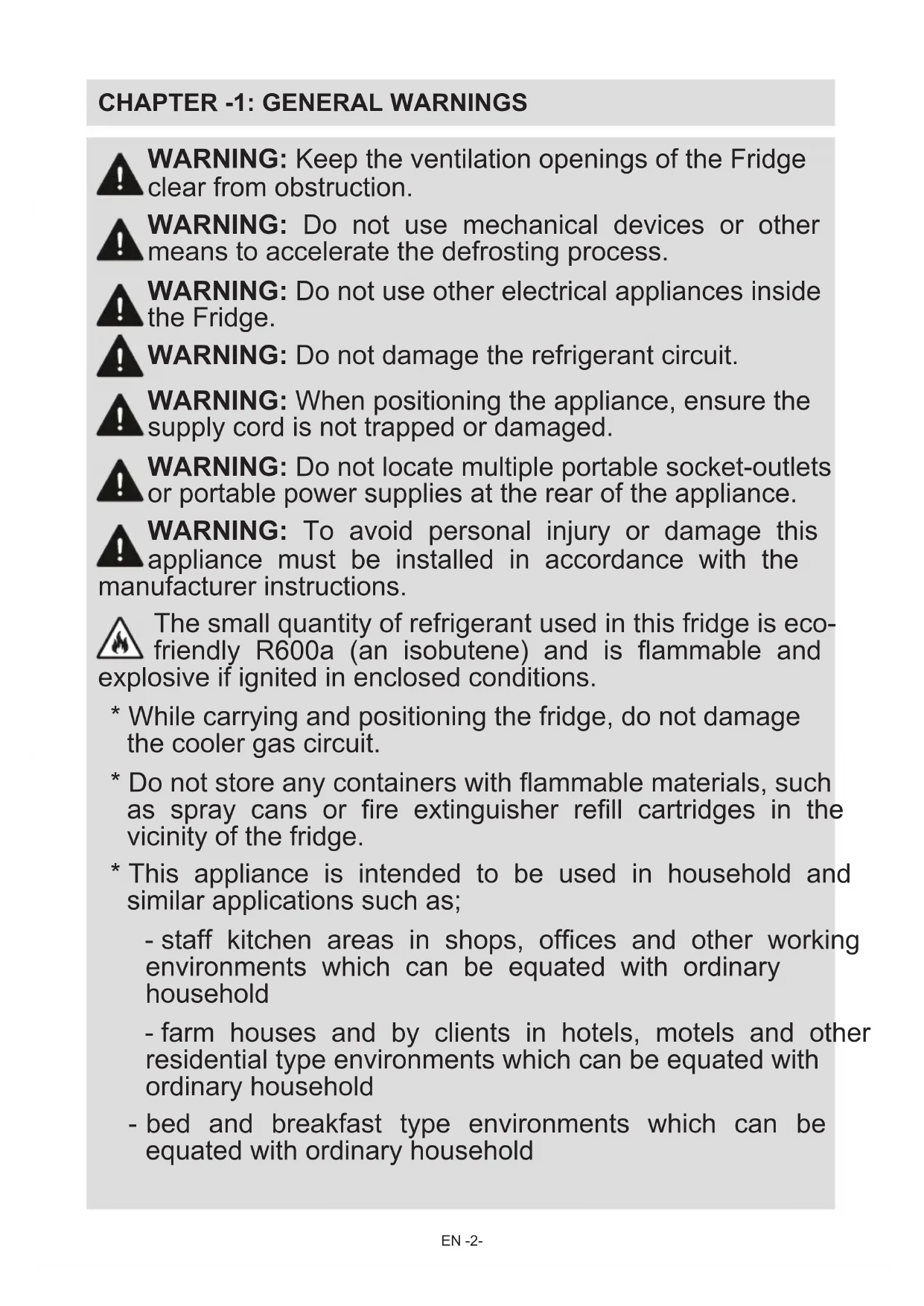 FIRE Warning; Risk of re / ammable materials Your fridge freezer conforms to current safety requirements. Inappropriate use can lead to personal injury and damage to property. To avoid the risk of damage read this manual carefully before using your fridge freezer for the rst time. It contains important safety information on the installation, safety, use and maintenance of your Fridge Freezer. Retain this manual for future use.EN -2-