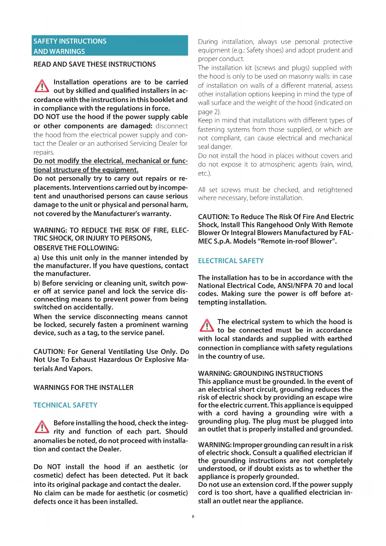 TECHNICAL SAFETY Before installing the hood, check the integ- rity and function of each part. Should anomalies be noted, do not proceed with installa- tion and contact the Dealer. Do NOT install the hood if an aesthetic (or cosmetic) defect has been detected. Put it back into its original package and contact the dealer. No claim can be made for aesthetic (or cosmetic) defects once it has been installed. During installation, always use personal protective equipment (e.g.: Safety shoes) and adopt prudent and proper conduct. The installation kit (screws and plugs) supplied with the hood is only to be used on masonry walls: in case of installation on walls of a different material, assess other installation options keeping in mind the type of wall surface and the weight of the hood (indicated on page 2). Keep in mind that installations with different types of fastening systems from those supplied, or which are not compliant, can cause electrical and mechanical seal danger. Do not install the hood in places without covers and do not expose it to atmospheric agents (rain, wind, etc.). All set screws must be checked, and retightened where necessary, before installation. CAUTION: To Reduce The Risk Of Fire And Electric Shock, Install This Rangehood Only With Remote Blower Or Integral Blowers Manufactured by FAL- MEC S.p.A. Models “Remote in-roof Blower”. ELECTRICAL SAFETY The installation has to be in accordance with the National Electrical Code, ANSI/NFPA 70 and local codes. Making sure the power is o before at- tempting installation. The electrical system to which the hood is to be connected must be in accordance with local standards and supplied with earthed connection in compliance with safety regulations in the country of use.