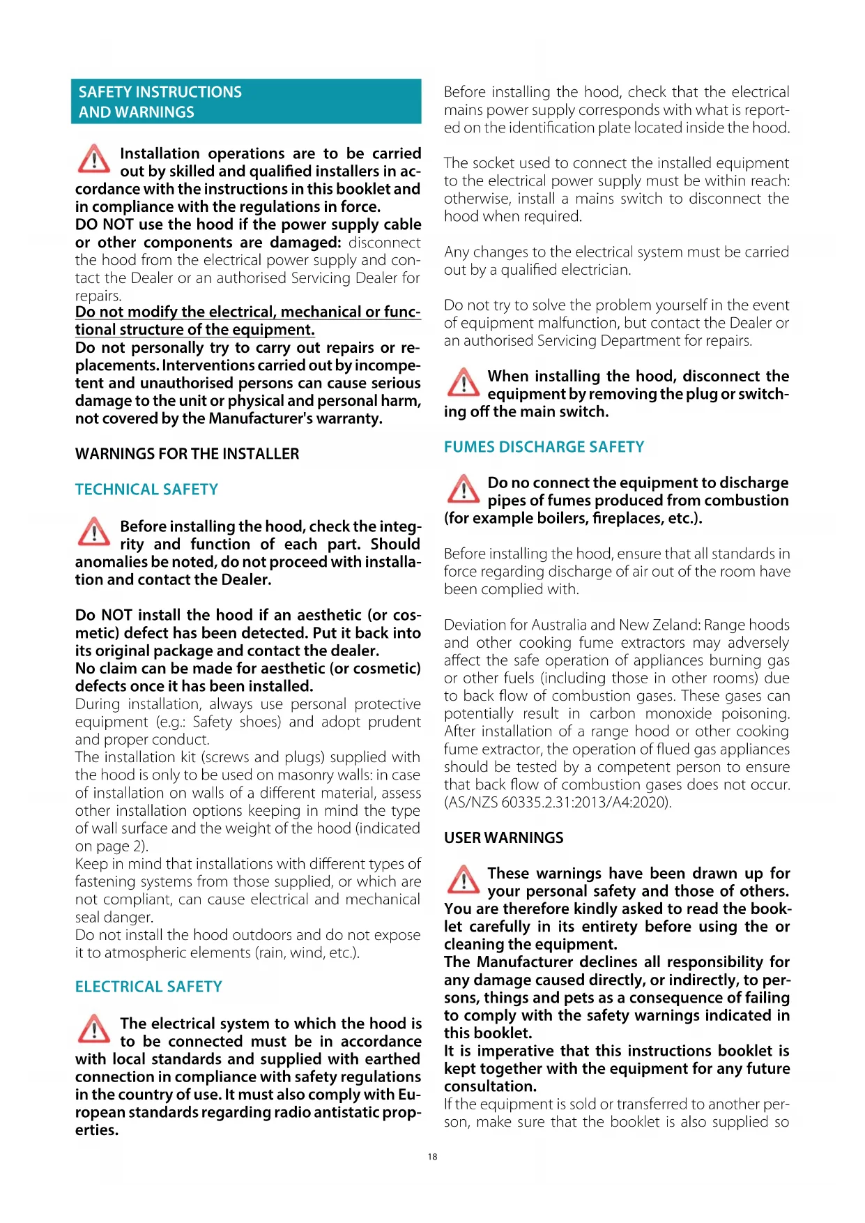 Do no connect the equipment to discharge pipes of fumes produced from combustion (for example boilers, replaces, etc.). Before installing the hood, ensure that all standards in force regarding discharge of air out of the room have been complied with. Deviation for Australia and New Zeland: Range hoods and other cooking fume extractors may adversely affect the safe operation of appliances burning gas or other fuels (including those in other rooms) due to back flow of combustion gases. These gases can potentially result in carbon monoxide poisoning. After installation of a range hood or other cooking fume extractor, the operation of flued gas appliances should be tested by a competent person to ensure that back flow of combustion gases does not occur. (AS/NZS 60335.2.31:2013/A4:2020). USER WARNINGS These warnings have been drawn up for your personal safety and those of others. You are therefore kindly asked to read the book- let carefully in its entirety before using the or cleaning the equipment. The Manufacturer declines all responsibility for any damage caused directly, or indirectly, to per- sons, things and pets as a consequence of failing to comply with the safety warnings indicated in this booklet. It is imperative that this instructions booklet is kept together with the equipment for any future consultation. If the equipment is sold or transferred to another per- son, make sure that the booklet is also supplied so19 ENGLISH that the new user can be made aware of the hood's operation and relative warnings. After the stainless steel hood has been installed, it will need to be cleaned to remove any residues re- maining from the protection adhesive as well as any grease and oil stains which, if not removed, can cause irreversible damage to the hood surface. To properly clean the unit, the manufacturer recommends using the supplied moist wipes, which are also available sold separately. Insist on original spare parts. INTENDED USE The equipment is solely intended to be used to extract fumes generated from cooking food in non-professional domestic kitchens: any other use is improper. Improper use can cause damage to persons, things, pets and exempts the Manu- facturer from any liability. The equipment can be used by children over the age of 8 and by persons with reduced physical, sensory and mental abilities, or with no experience or knowl- edge, as long as they do so under supervision or after having received relative instructions regarding safe use of the equipment and understanding of the dan- gers connected to it. Children are not to play with the equipment. Clean- ing and maintenance by the user must not be carried out by children without supervision.