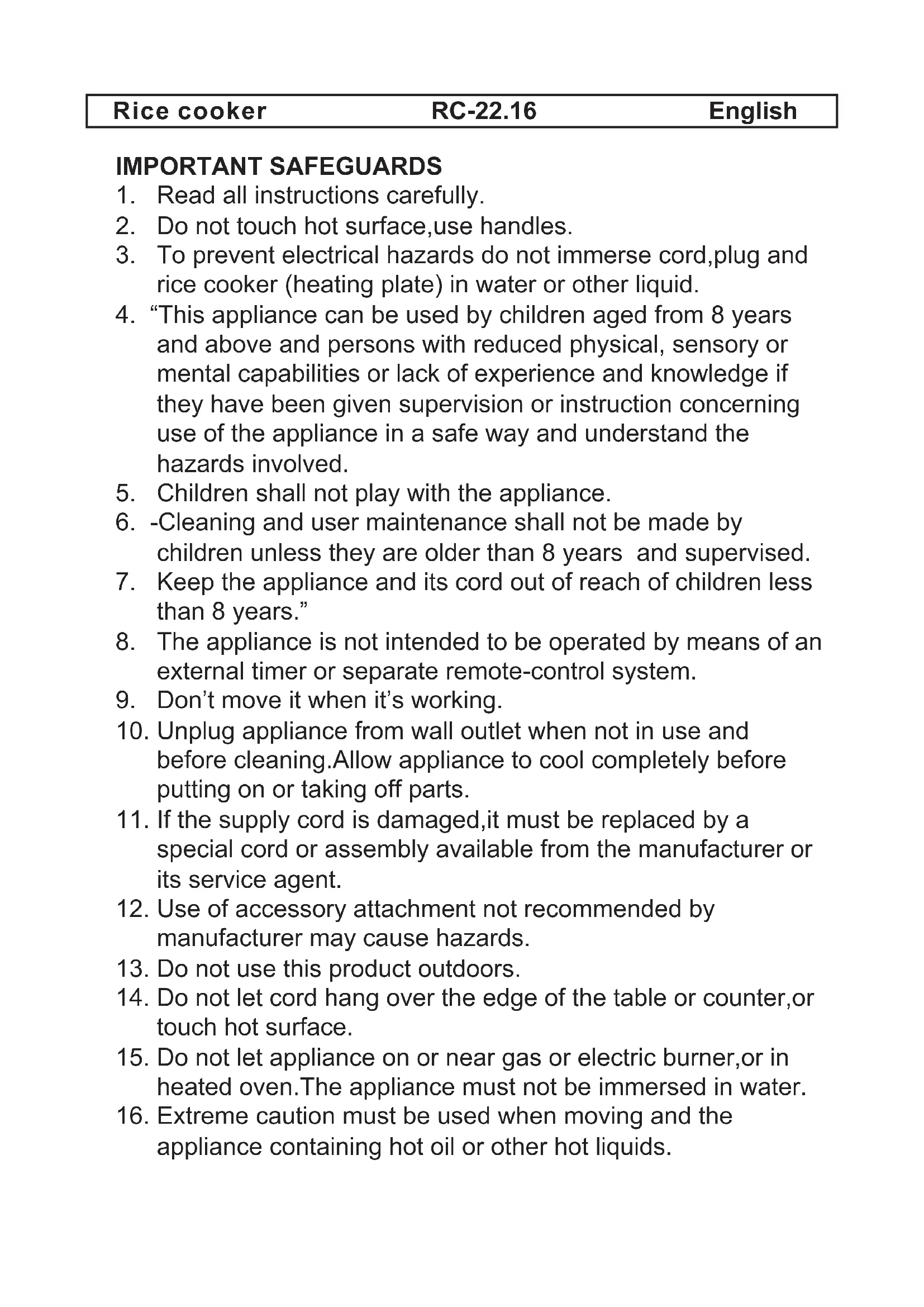 7Rice cooker RC-22.16 English IMPORTANT SAFEGUARDS