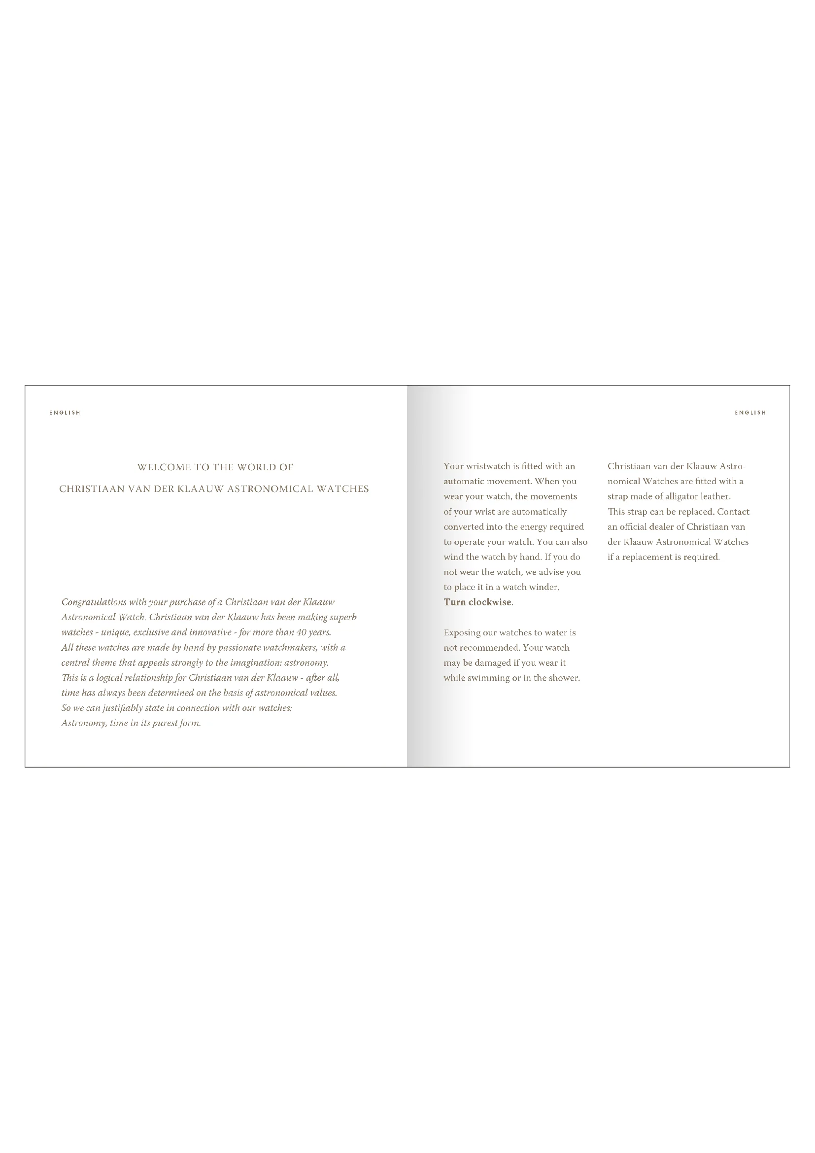Congratulations with your purchase of a Christiaan van der Klaauw Astronomical Watch. Christiaan van der Klaauw has been making superb watches - unique, exclusive and innovative - for more than 40 years. All these watches are made by hand by passionate watchmakers, with a central theme that appeals strongly to the imagination: astronomy. is is a logical relationship for Christiaan van der Klaauw - after all, time has always been determined on the basis of astronomical values. So we can justiably state in connection with our watches: Astronomy, time in its purest form. Your wristwatch is tted with an automatic movement. When you wear your watch, the movements of your wrist are automatically converted into the energy required to operate your watch. You can also wind the watch by hand. If you do not wear the watch, we advise you to place it in a watch winder. Turn clockwise. Exposing our watches to water is not recommended. Your watch may be damaged if you wear it while swimming or in the shower. Christiaan van der Klaauw Astro- nomical Watches are tted with a strap made of alligator leather. is strap can be replaced. Contact an ocial dealer of Christiaan van der Klaauw Astronomical Watches if a replacement is required. ENGLISHSpecications e following information is displayed on the Planetarium: