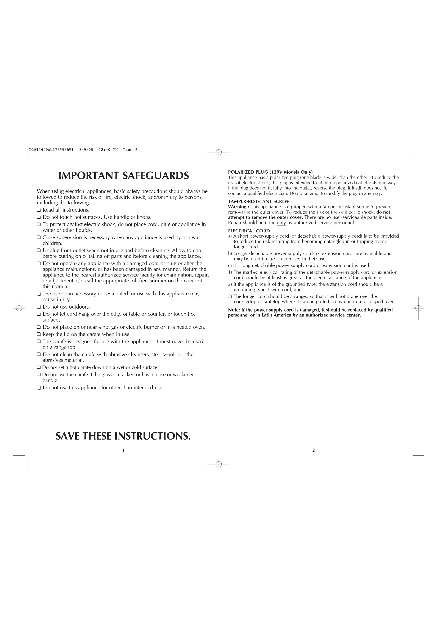 Do not use this appliance for other than intended use. SAVE THESE INSTRUCTIONS. POLARIZED PLUG (120V Models Only) This appliance has a polarized plug (one blade is wider than the other). To reduce the risk of electric shock, this plug is intended to fit into a polarized outlet only one way. If the plug does not fit fully into the outlet, reverse the plug. If it still does not fit, contact a qualified electrician. Do not attempt to modify the plug in any way. TAMPER-RESISTANT SCREW