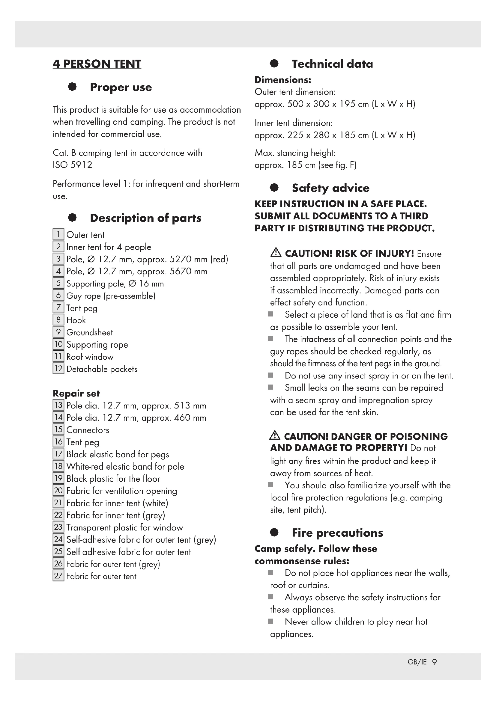 PARTY IF DISTRIBUTING THE PRODUCT. m CAUTION! RISK OF INJURY! Ensure that all parts are undamaged and have been assembled appropriately. Risk of injury exists if assembled incorrectly. Damaged parts can effect safety and function. Select a piece of land that is as flat and firm as possible to assemble your tent. The intactness of all connection points and the guy ropes should be checked regularly, as should the firmness of the tent pegs in the ground. Do not use any insect spray in or on the tent. Small leaks on the seams can be repaired with a seam spray and impregnation spray can be used for the tent skin. m CAUTION! DANGER OF POISONING AND DAMAGE TO PROPERTY! Do not light any fires within the product and keep it away from sources of heat. You should also familiarize yourself with the local fire protection regulations (e.g. camping site, tent pitch). § Fire precautions Camp safely. Follow these commonsense rules: Do not place hot appliances near the walls, roof or curtains. Always observe the safety instructions for these appliances. Never allow children to play near hot appliances.10 GB/IE Keep exits clear. Do not block the exit with objects. Make sure you know the fire precaution arrangements on the site. § Tent assembly Inside the carrying bag there is a label with a QR-code. If the QR code is scanned you will receive details about how to pitch the product. Please ensure that the product is only assembled by people with the appropriate skills. Note: The polyester material of the tent consists of water-repellent material. It is possible that during the first rainfall the tent will not be completely watertight. However, the threads of the tent will contract when exposed to water so that after a short time the tent will become watertight. Erect the product in accordance with the illustrations A to F. Illustration A: