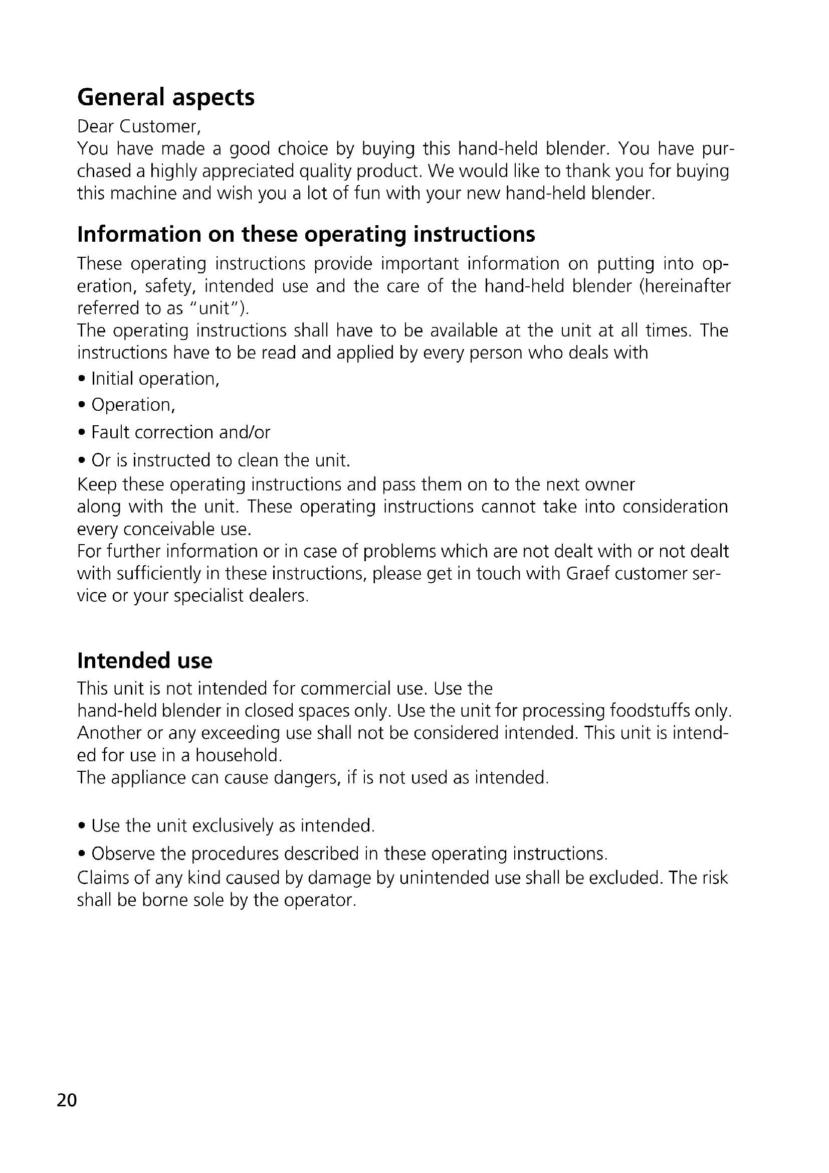- Or is instructed to clean the unit. Keep these operating instructions and pass them on to the next owner along with the unit. These operating instructions cannot take into consideration every conceivable use. For further information or in case of problems which are not dealt with or not dealt with sufciently in these instructions, please get in touch with Graef customer ser- vice or your specialist dealers. Intended use This unit is not intended for commercial use. Use the hand-held blender in closed spaces only. Use the unit for processing foodstuffs only. Another or any exceeding use shall not be considered intended. This unit is intend- ed for use in a household. The appliance can cause dangers, if is not used as intended.
