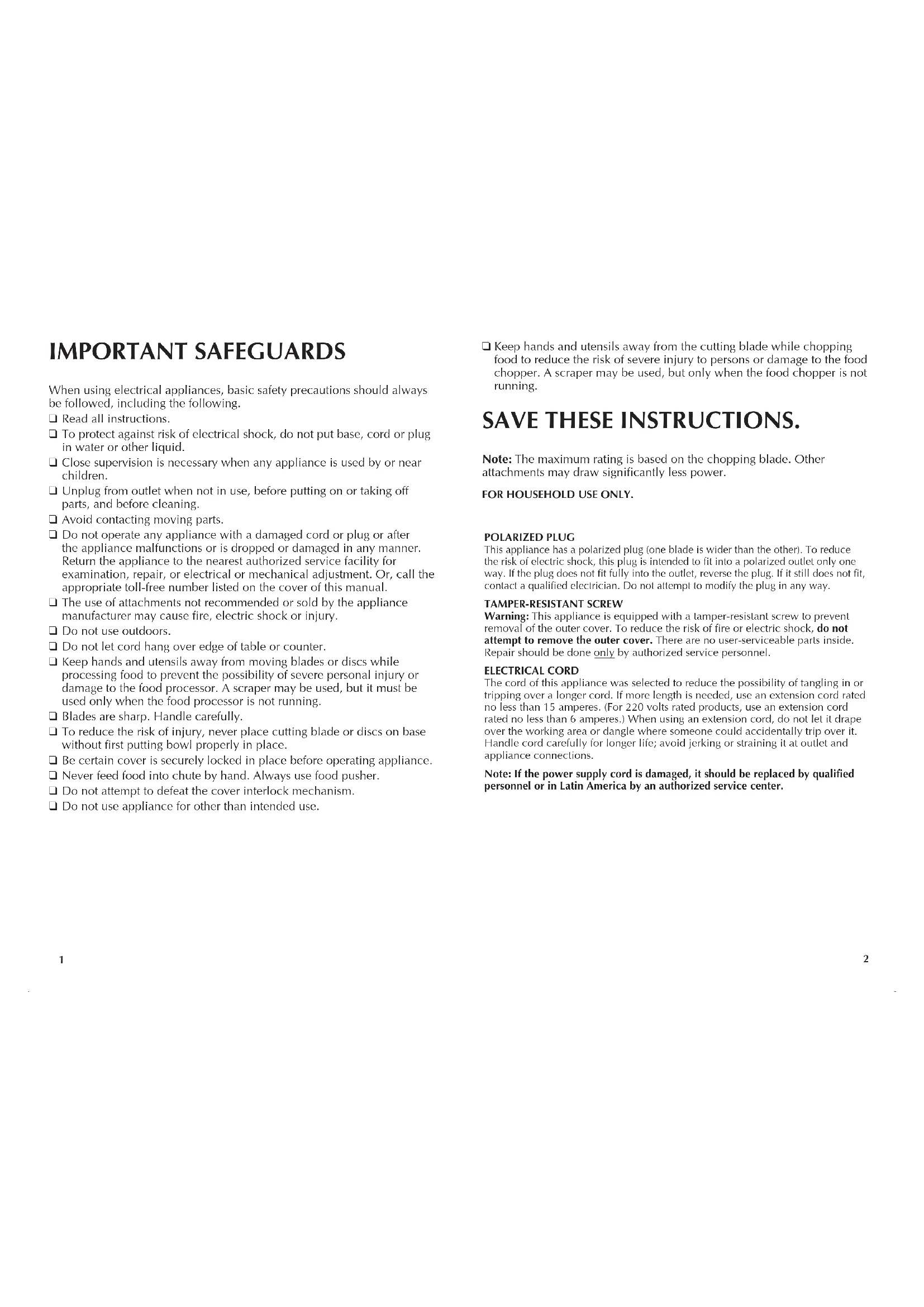 Keep hands and utensils away from the cutting blade while chopping food to reduce the risk of severe injury to persons or damage to the food chopper. A scraper may be used, but only when the food chopper is not running. The maximum rating is based on the chopping blade. Other attachments may draw signicantly less power.