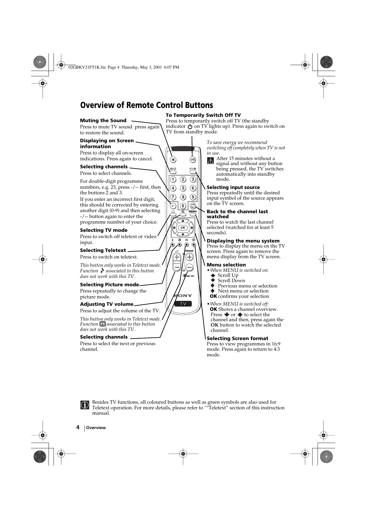02GBKV21FT1K.fm Page 4 Thursday, May 3, 2001 6:07 PM Overview of Remote Control Buttons Muting the Sound Press to mute TV sound. press again to restore the sound. To Temporarily Switch Off TV Press to temporarily switch off TV (the standby indicator on TV lights up). Press again to switch on TV from standby mode. Displaying on Screen information Press to display all on-screen indications. Press again to cancel. Selecting channels Press to select channels. For double-digit programme numbers, e.g. 23, press -/-- first, then the buttons 2 and 3. If you enter an incorrect first digit, this should be corrected by entering another digit (0-9) and then selecting -/-- button again to enter the programme number of your choice. Selecting TV mode Press to switch off teletext or video input. Selecting Teletext Press to switch on teletext. This button only works in Teletext mode. Function associated to this button does not work with this TV. Selecting Picture mode Press repeatedly to change the picture mode. Adjusting TV volume Press to adjust the volume of the TV. This button only works in Teletext mode. Function associated to this button does not work with this TV. Selecting channels Press to select the next or previous channel.