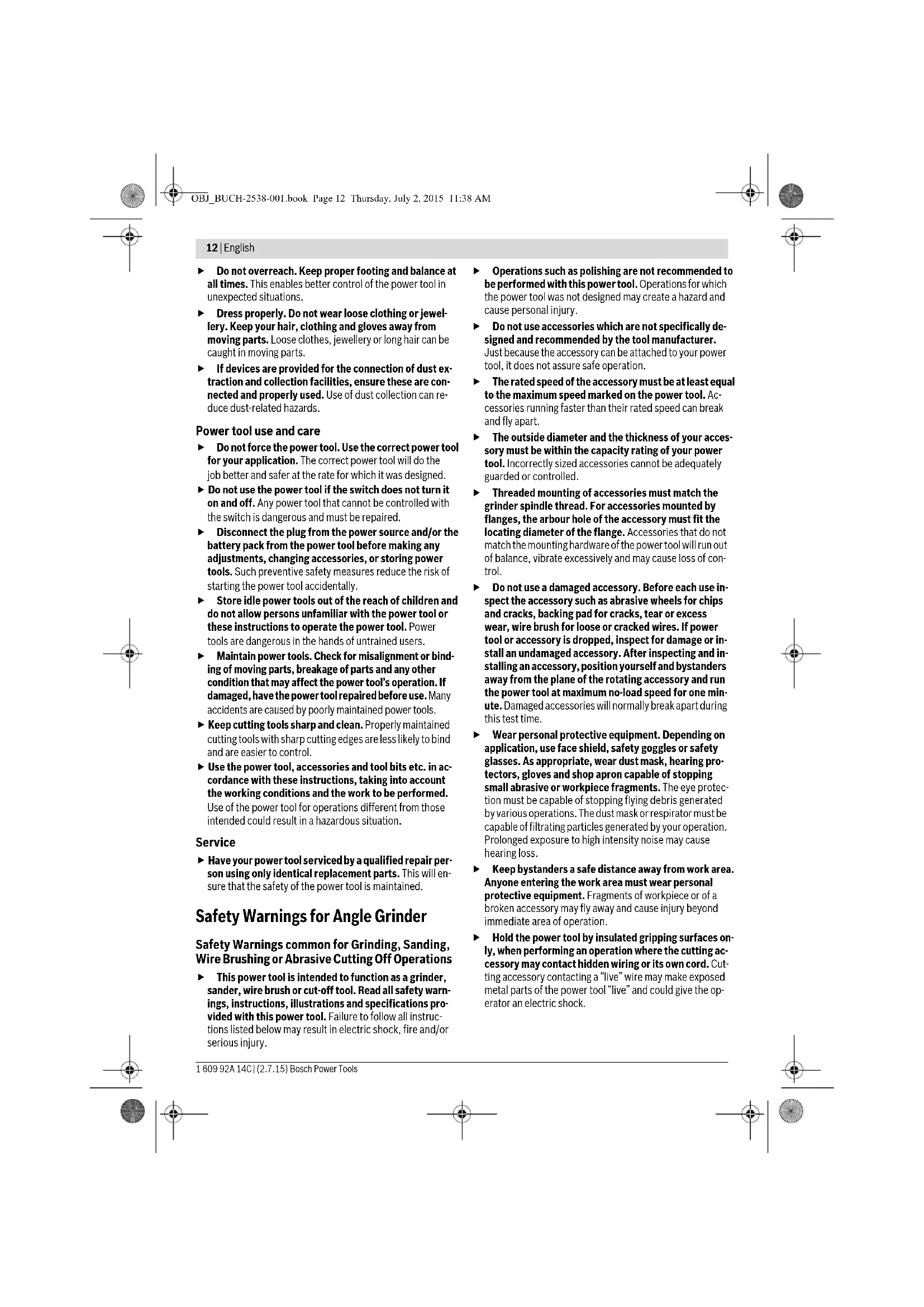 OBJ_BUCH-2538-001.book Page 15 Thursday, July 2, 2015 11:38 AM16 | English 1 609 92A 14C | (2.7.15) Bosch Power Tools Delivery Scope Angle grinder, protection guard, auxiliary handle. Special protection guards, application tools and other acces- sories shown or described are not part of the standard deliv- ery scope. A complete overview of accessories can be found in our ac- cessories program. Intended Use The machine is intended for roughing metal, stone and ceram- ic materials and for drilling tiles. For cutting with bonded abrasives, a special cutting guard (accessory) must be used. When cutting in stone, provide for sufficient dust extraction. Together with the hand guard (accessory), the machine can be used for brushing and grinding/sanding with elastic sand- ing plates. The machine is suitable only for working without water. Technical Data The technical data of the machine are listed in the table on page 264–266. The values given are valid for a nominal voltage [U] of 230 V. For different voltages and models for specific countries, these values can vary. Please observe the article number on the type plate of your machine. The trade names of the individual machines may vary. Declaration of Conformity We declare under our sole responsibility that the product de- scribed under “Technical Data” is in conformity with all rele- vant provisions of the directives 2011/65/EU, until 19 April 2016: 2004/108/EC, from 20 April 2016 on: 2014/30/EU, 2006/42/EC including their amendments and complies with the following standards: EN 60745-1, EN 60745-2-3. Technical file (2006/42/EC) at: Robert Bosch GmbH, PT/ETM9, 70764 Leinfelden-Echterdingen, GERMANY Robert Bosch GmbH, Power Tools Division 70764 Leinfelden-Echterdingen, GERMANY Leinfelden, 02.07.2015 Noise/Vibration Information The measured values of the machine are listed in the table on page 264–266. Sound emission values determined according to EN 60745-2-3. Vibration total values a