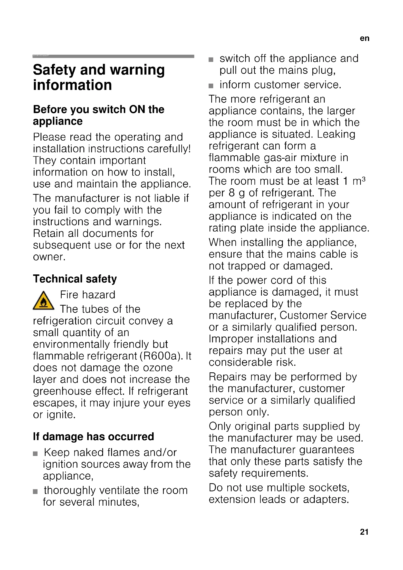enTable of Contents enInstruction for Use Safety and warning information Before you switch ON the appliance Please read the operating and installation instructions carefully! They contain important information on how to install, use and maintain the appliance. The manufacturer is not liable if you fail to comply with the instructions and warnings. Retain all documents for subsequent use or for the next owner. Technical safety Fire hazard The tubes of the refrigeration circuit convey a small quantity of an environmentally friendly but flammable refrigerant (R600a). It does not damage the ozone layer and does not increase the greenhouse effect. If refrigerant escapes, it may injure your eyes or ignite. If damage has occurred ■ Keep naked flames and/or ignition sources away from the appliance, ■ thoroughly ventilate the room for several minutes, ■ switch off the appliance and pull out the mains plug, ■ inform customer service. The more refrigerant an appliance contains, the larger the room must be in which the appliance is situated. Leaking refrigerant can form a flammable gas-air mixture in rooms which are too small. The room must be at least 1 m³ per 8 g of refrigerant. The amount of refrigerant in your appliance is indicated on the rating plate inside the appliance. When installing the appliance, ensure that the mains cable is not trapped or damaged. If the power cord of this appliance is damaged, it must be replaced by the manufacturer, Customer Service or a similarly qualified person. Improper installations and repairs may put the user at considerable risk. Repairs may be performed by the manufacturer, customer service or a similarly qualified person only. Only original parts supplied by the manufacturer may be used. The manufacturer guarantees that only these parts satisfy the safety requirements. Do not use multiple sockets, extension leads or adapters.en