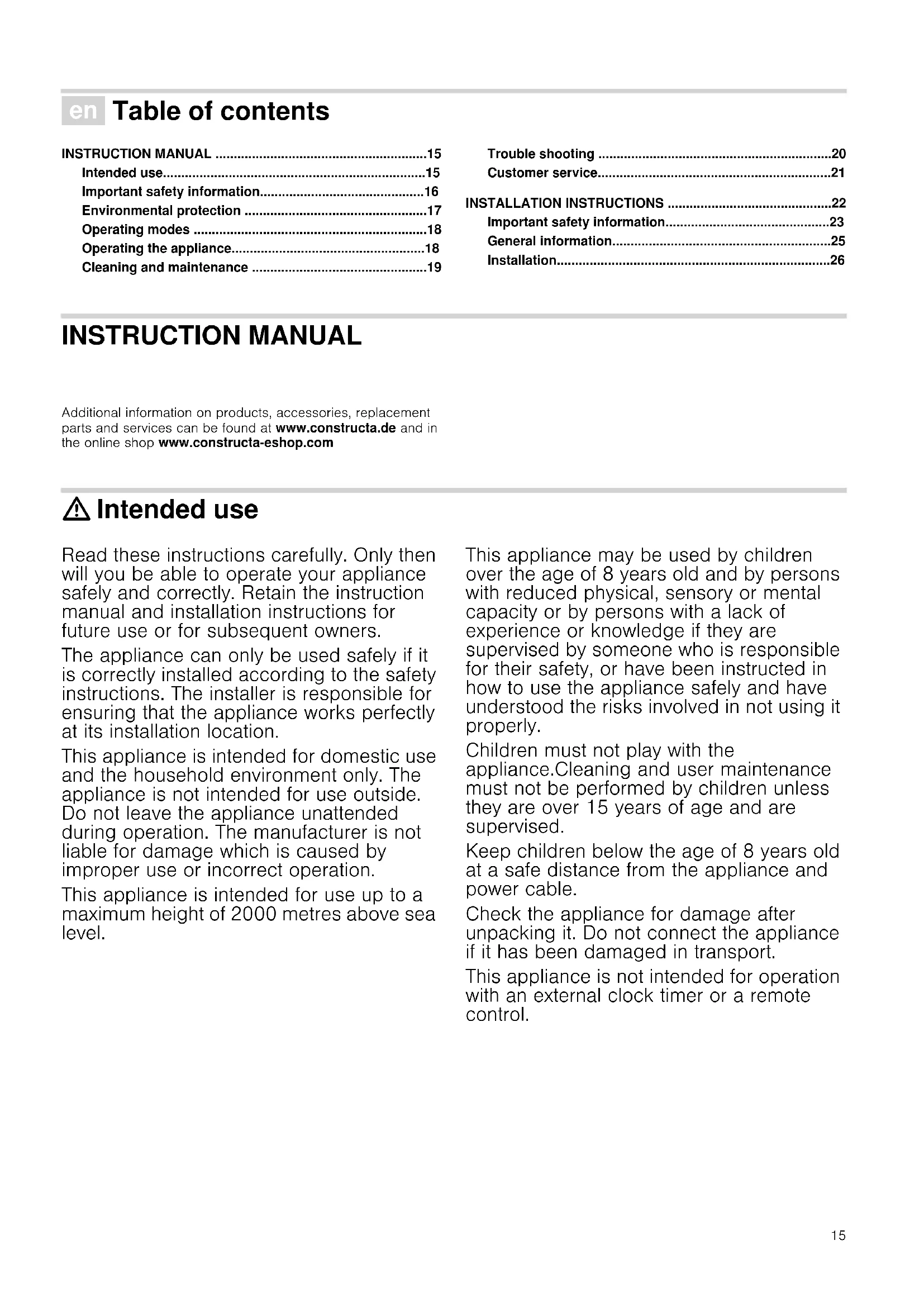 - Installation INSTRUCTION MANUAL Produktinfo Additional information on products, accessories, replacement parts and services can be found at www.constructa.de and in the online shop www.constructa-eshop.com : Intended use Intended us e Read these instructions carefully. Only then will you be able to operate your appliance safely and correctly. Retain the instruction manual and installation instructions for future use or for subsequent owners. The appliance can only be used safely if it is correctly installed according to the safety instructions. The installer is responsible for ensuring that the appliance works perfectly at its installation location. This appliance is intended for domestic use and the household environment only. The appliance is not intended for use outside. Do not leave the appliance unattended during operation. The manufacturer is not liable for damage which is caused by improper use or incorrect operation. This appliance is intended for use up to a maximum height of 2000 metres above sea level. This appliance may be used by children over the age of 8 years old and by persons with reduced physical, sensory or mental capacity or by persons with a lack of experience or knowledge if they are supervised by someone who is responsible for their safety, or have been instructed in how to use the appliance safely and have understood the risks involved in not using it properly. Children must not play with the appliance.Cleaning and user maintenance must not be performed by children unless they are over 15 years of age and are supervised. Keep children below the age of 8 years old at a safe distance from the appliance and power cable. Check the appliance for damage after unpacking it. Do not connect the appliance if it has been damaged in transport. This appliance is not intended for operation with an external clock timer or a remote control.16 : Important safety information Impor t ant saf et y informat i on Danger of suffocation! Packaging material is dangerous to children. Never allow children to play with packaging material. Danger of death! Risk of poisoning from flue gases that are drawn back in. Always ensure adequate fresh air in the room if the appliance is being operated in exhaust air mode at the same time as room air-dependent heat-producing appliance is being operated. Room air-dependent heat-producing appliances (e.g. gas, oil, wood or coal- operated heaters, continuous flow heaters or water heaters) obtain combustion air from the room in which they are installed and discharge the exhaust gases into the open air through an exhaust gas system (e.g. a chimney). In combination with an activated vapour extractor hood, room air is extracted from the kitchen and neighbouring rooms - a partial vacuum is produced if not enough fresh air is supplied. Toxic gases from the chimney or the extraction shaft are sucked back into the living space. p. 26