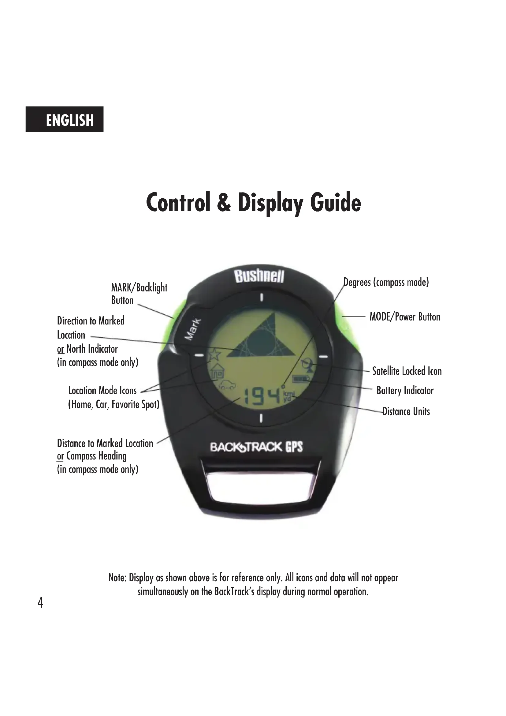 3. The BackTrack starts out in Compass Mode the first time you turn it on. An arrow points North, and the display shows