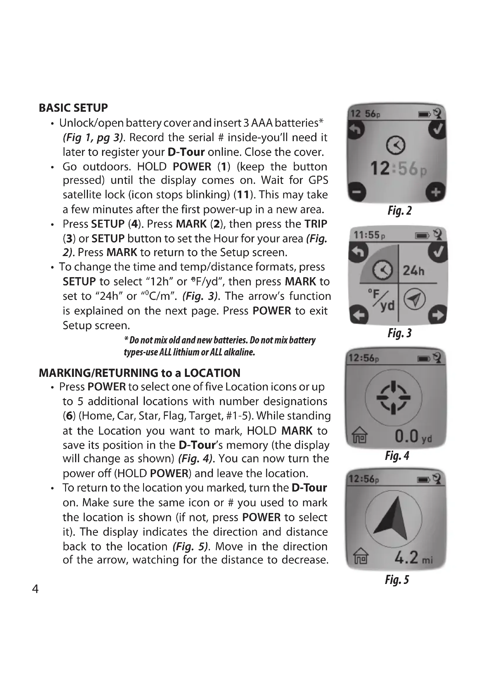 - To return to the location you marked, turn the D-Tour on. Make sure the same icon or # you used to mark the location is shown (if not, press POWER to select it). The display indicates the direction and distance back to the location (Fig. 5). Move in the direction of the arrow, watching for the distance to decrease. Fig. 2 Fig. 3 Fig. 4 Fig. 5
