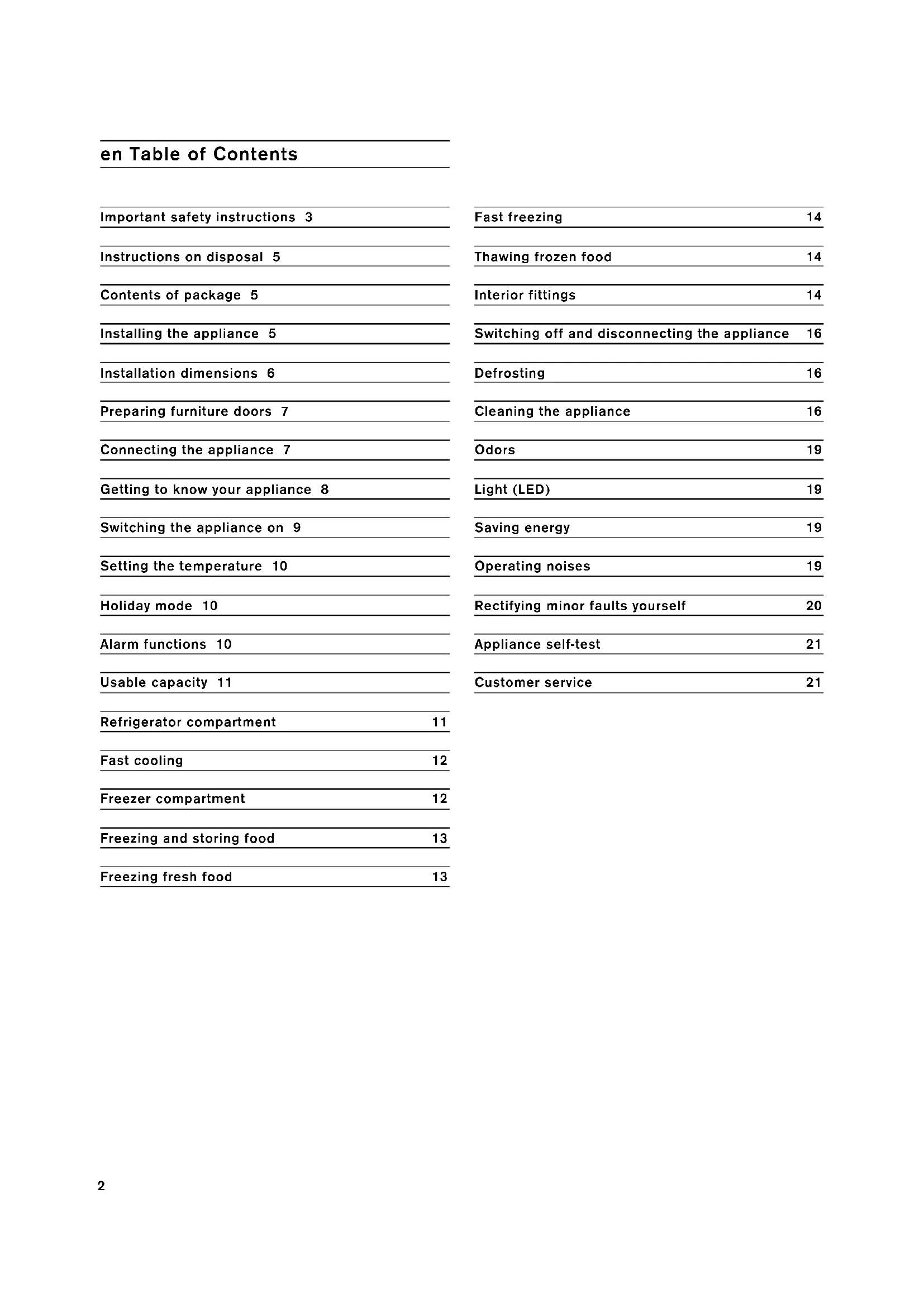 occurring after 24 hours. Light (LED) Your appliance features a maintenance-free LED light. These lights may be repaired by customer service or authorized technicians only. Saving energy ▯ Install the appliance in a dry, ventilated room. The appliance should not be installed in direct sunlight or in the vicinity of heat sources (e.g. radiator, cooker). If required, use an insulating plate. ▯ Select 560 mm niche depth. A smaller niche depth will result in a higher energy consumption. ▯ Allow warm food and drinks to cool down before placing them in the appliance. ▯ Thaw frozen food in the refrigerator compartment and use the low temperature of the frozen food to cool refrigerated food. ▯ Open the appliance as briefly as possible. ▯ Make sure that the freezer compartment door has always been closed properly! ▯ The arrangement of the fittings does not affect the energy absorption of the appliance. Operating noises Completely normal noises Note: When fast freezing is switched on, increased operating noise may occur. Droning Motors are running (e.g. refrigeration units, fan). Bubbling, humming or gurgling noises Refrigerant flowing through the pipes. Clicking Motor, switches or solenoid valves are switching on/ off. Cracking Automatic defrosting is running. Preventing noises The appliance is not level Please align the appliance with a spirit level. Use the height-adjustable feet or place packing underneath them. The appliance is not free-standing Please move the appliance away from adjacent units or appliances. Containers or storage areas wobble or stick Check which parts are removable and, if necessary, re-insert them correctly. Bottles or receptacles are touching each other Move the bottles or receptacles slightly away from each other.20 Rectifying minor faults yourself Before you call customer service: Check whether you can eliminate the fault yourself based on the following information. Customer service will charge you for advice – even if the appliance is still under guarantee! Fault Possible cause Remedial action Temperature differs greatly from the set value. In certain cases it may be enough to switch off the appliance for 5 minutes. If the temperature is too high, wait a few hours and check whether the temperature has approached the set value. If the temperature is too low, check the temperature again the next day. Displays do not illuminate. Power cut; the fuse has tripped; the mains plug has not been inserted properly. Connect the mains plug. Check whether the power is on, and check the fuses. Temperature display indicates “E..”. Electronics have detected a fault. Call customer service. Warning signal sounds, alarm button Ú lights up. The freezer section is too warm! Frozen food is at risk! To switch off the warning signal, press the alarm button Ú. Appliance is open. Close the appliance. Ventilation openings have been cov- ered. Ensure that there is adequate ventilation. Too much food was placed in the freezer at once. Do not exceed max. freezing capacity. When the fault has been eliminated, the alarm but- ton Ú goes out shortly afterwards. The temperature display for the freezer section flashes, a warning signal sounds and the alarm button Ú is lit. The freezer section is too warm! Frozen food is at risk! To switch off the warning signal, press the alarm button Ú. Appliance is open. Close the appliance. Ventilation openings have been cov- ered. Ensure that there is adequate ventilation. Too much food was placed in the freezer at once. Do not exceed max. freezing capacity. When the fault has been eliminated, the alarm dis- play goes out shortly afterwards. Temperature display for the freezer section flashes. A fault caused the freezer section to become too warm in the past. When the alarm button Ú is pressed, the tempera- ture display stops flashing. The temperature display indicates for five seconds the warmest temperature which was reached in the freezer section. Appliance is not cooling, tem- perature display and light are lit. Showroom mode is switched on. Start appliance self-test (see chapter Appliance self- test). When the program has ended, the appliance switches over to normal operation.21 Appliance self-test Your appliance features an automatic self-test program which indicates sources of faults that may be repaired by customer service only. Starting the appliance self-test