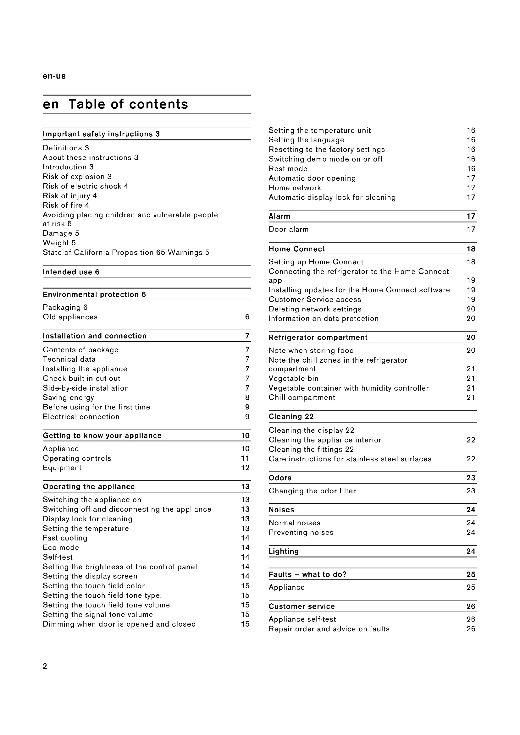 - es Instrucciones de uso RC462704 RC472704 RC492704 Refrigerator Réfrigérateur Frigorífico2 en-us en Table of contents en Instruction manual Important safety instructions 3 Definitions 3 About these instructions 3 Introduction 3 Risk of explosion 3 Risk of electric shock 4 Risk of injury 4 Risk of fire 4 Avoiding placing children and vulnerable people at risk 5 Damage 5 Weight 5 State of California Proposition 65 Warnings 5 Intended use 6 Environmental protection 6 Packaging 6 Old appliances 6 Installation and connection 7 Contents of package 7 Technical data 7 Installing the appliance 7 Check built-in cut-out 7 Side-by-side installation 7 Saving energy 8 Before using for the first time 9 Electrical connection 9 Getting to know your appliance 10 Appliance 10 Operating controls 11 Equipment 12 Operating the appliance 13 Switching the appliance on 13 Switching off and disconnecting the appliance 13 Display lock for cleaning 13 Setting the temperature 13 Fast cooling 14 Eco mode 14 Self-test 14 Setting the brightness of the control panel 14 Setting the display screen 14 Setting the touch field color 15 Setting the touch field tone type. 15 Setting the touch field tone volume 15 Setting the signal tone volume 15 Dimming when door is opened and closed 15 Setting the temperature unit 16 Setting the language 16 Resetting to the factory settings 16 Switching demo mode on or off 16 Rest mode 16 Automatic door opening 17 Home network 17 Automatic display lock for cleaning 17 Alarm 17 Door alarm 17 Home Connect 18 Setting up Home Connect 18 Connecting the refrigerator to the Home Connect app 19 Installing updates for the Home Connect software 19 Customer Service access 19 Deleting network settings 20 Information on data protection 20 Refrigerator compartment 20 Note when storing food 20 Note the chill zones in the refrigerator compartment 21 Vegetable bin 21 Vegetable container with humidity controller 21 Chill compartment 21 Cleaning 22 Cleaning the display 22 Cleaning the appliance interior 22 Cleaning the fittings 22 Care instructions for stainless steel surfaces 22 Odors 23 Changing the odor filter 23 Noises 24 Normal noises 24 Preventing noises 24 Lighting 24 Faults – what to do? 25 Appliance 25 Customer service 26 Appliance self-test 26 Repair order and advice on faults 263 9 Important safety instructions READ INSTRUCTIONS - DO NOT DISCARD! p. 53