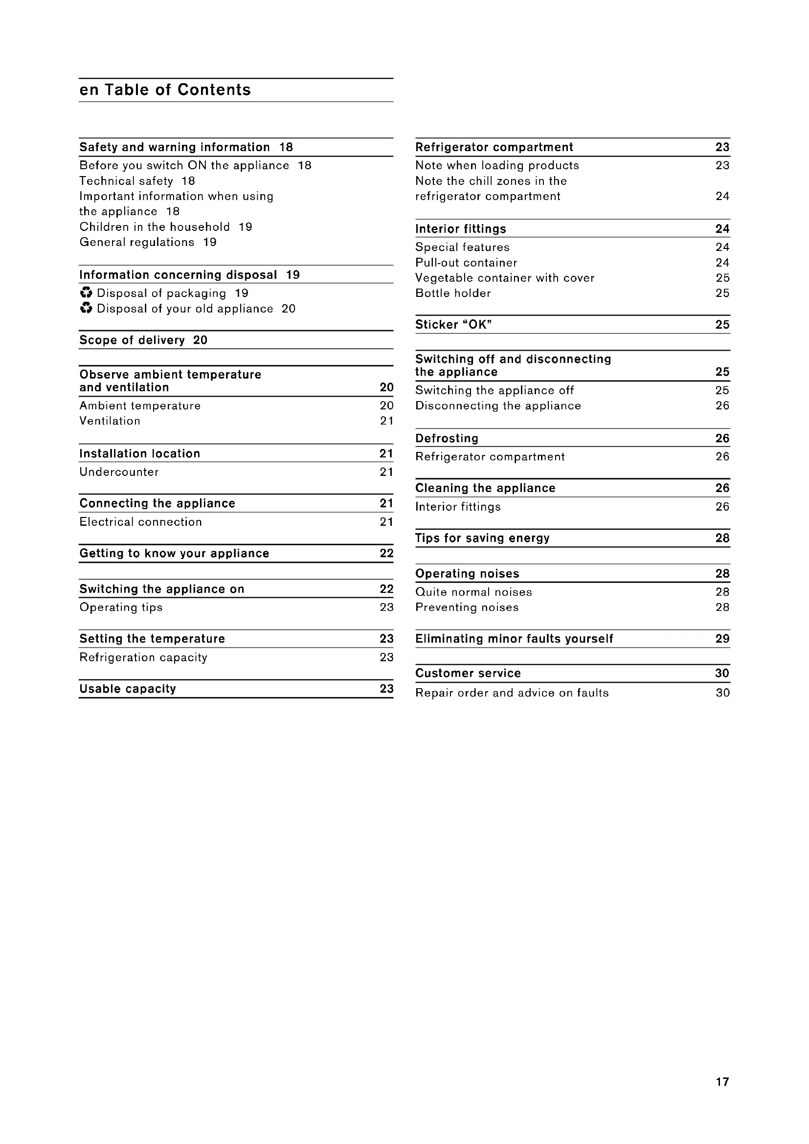 - Disposal of your old appliance 20 Scope of delivery 20 Observe ambient temperature and ventilation 20 Ambient temperature 20 Ventilation 21 Installation location 21 Undercounter 21 Connecting the appliance 21 Electrical connection 21 Getting to know your appliance 22 Switching the appliance on 22 Operating tips 23 Setting the temperature 23 Refrigeration capacity 23 Usable capacity 23 Refrigerator compartment 23 Note when loading products 23 Note the chill zones in the refrigerator compartment 24 Interior fittings 24 Special features 24 Pull-out container 24 Vegetable container with cover 25 Bottle holder 25 Sticker “OK” 25 Switching off and disconnecting the appliance 25 Switching the appliance off 25 Disconnecting the appliance 26 Defrosting 26 Refrigerator compartment 26 Cleaning the appliance 26 Interior fittings 26 Tips for saving energy 28 Operating noises 28 Quite normal noises 28 Preventing noises 28 Eliminating minor faults yourself 29 Customer service 30 Repair order and advice on faults 3018 m Safety and warning information Before you switch ON the appliance Please read the operating and installation instructions carefully! They contain important information on how to install, use and maintain the appliance. The manufacturer is not liable if you fail to comply with the instructions and warnings. Retain all documents for subsequent use or for the next owner. Technical safety The appliance contains a small quantity of environmentally friendly but flammable refrigerant R600a. Ensure that the tubing of the refrigerant circuit is not damaged during transportation and installation. Leaking refrigerant may cause eye injuries or ignite. If damage has occurred ▯ Keep naked flames and/or ignition sources away from the appliance, ▯ thoroughly ventilate the room for several minutes, ▯ switch off the appliance and pull out the mains plug, ▯ inform customer service. The more refrigerant an appliance contains, the larger the room must be in which the appliance is situated. Leaking refrigerant can form a flammable gas-air mixture in rooms which are too small. The room must be at least 1 m³ per 8 g of refrigerant. The amount of refrigerant in your appliance is indicated on the rating plate inside the appliance. If the power cord of this appliance is damaged, it must be replaced by the manufacturer, customer service or a similarly qualified person. Improper installations and repairs may put the user at considerable risk. Repairs may be performed by the manufacturer, customer service or a similarly qualified person only. Only original parts supplied by the manufacturer may be used. The manufacturer guarantees that only these parts satisfy the safety requirements. A extension cable may be purchased from customer service only. Important information when using the appliance ▯ Never use electrical appliances inside the appliance (e.g. heater, electric ice maker, etc.). Explosion hazard! ▯ Never defrost or clean the appliance with a steam cleaner! The steam may penetrate electrical parts and cause a short-circuit. Risk of electric shock! ▯ Do not use pointed or sharp-edged implements to remove frost or layers of ice. You could damage the refrigerant tubes. Leaking refrigerant may cause eye injuries or ignite. ▯ Do not store products which contain flammable propellants (e.g. spray cans) or explosive substances in the appliance. Explosion hazard! ▯ Do not stand on or lean heavily against base of appliance, drawers or doors, etc ▯ For defrosting and cleaning, pull the mains plug out or switch off the fuse. Do not pull out the mains plug by tugging on the power cord. ▯ Store high-percentage alcohol tightly closed and standing up. ▯ Keep plastic parts and the door seal free of oil and grease. Otherwise, parts and door seal will become porous. ▯ Never cover or block the ventilation openings of the appliance!19 ▯ Avoiding placing children and vulnerable people at risk: At risk are children, people who have limited physical, mental or sensory abilities, as well as people who have inadequate knowledge concerning safe operation of the appliance. Ensure that children and vulnerable people have understood the hazards. A person responsible for safety must supervise or instruct children and vulnerable people who are using the appliance. Only children from 8 years and above may use the appliance. Supervise children who are cleaning and maintaining the appliance. Never allow children to play with the appliance. Children in the household ▯ Keep children away from packaging and its parts. Danger of suffocation from folding cartons and plastic film! ▯ Do not allow children to play with the appliance! ▯ If the appliance features a lock: keep the key out of the reach of children! General regulations The appliance is suitable for refrigerating food. This appliance is intended for use in the home and the home environment. The appliance is suppressed according to EU Directive 2004/108/EC. The refrigeration circuit has been checked for leaks. This product complies with the relevant safety regulations for electrical appliances (EN 60335-2-24). This appliance is intended for use up to a maximum height of 2000 metres above sea level. Information concerning disposal