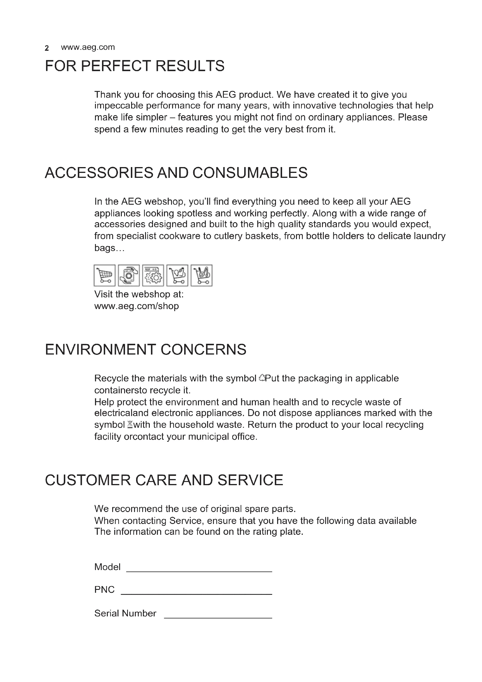 appliances looking spotless and working perfectly. Along with a wide range of accessories designed and built to the high quality standards you would expect, from specialist cookware to cutlery baskets, from bottle holders to delicate laundry bags… Visit the webshop at: www.aeg.com/shop ENVIRONMENT CONCERNS Recycle the materials with the symbol Put the packaging in applicable containersto recycle it. Help protect the environment and human health and to recycle waste of electricaland electronic appliances. Do not dispose appliances marked with the symbol with the household waste. Return the product to your local recycling