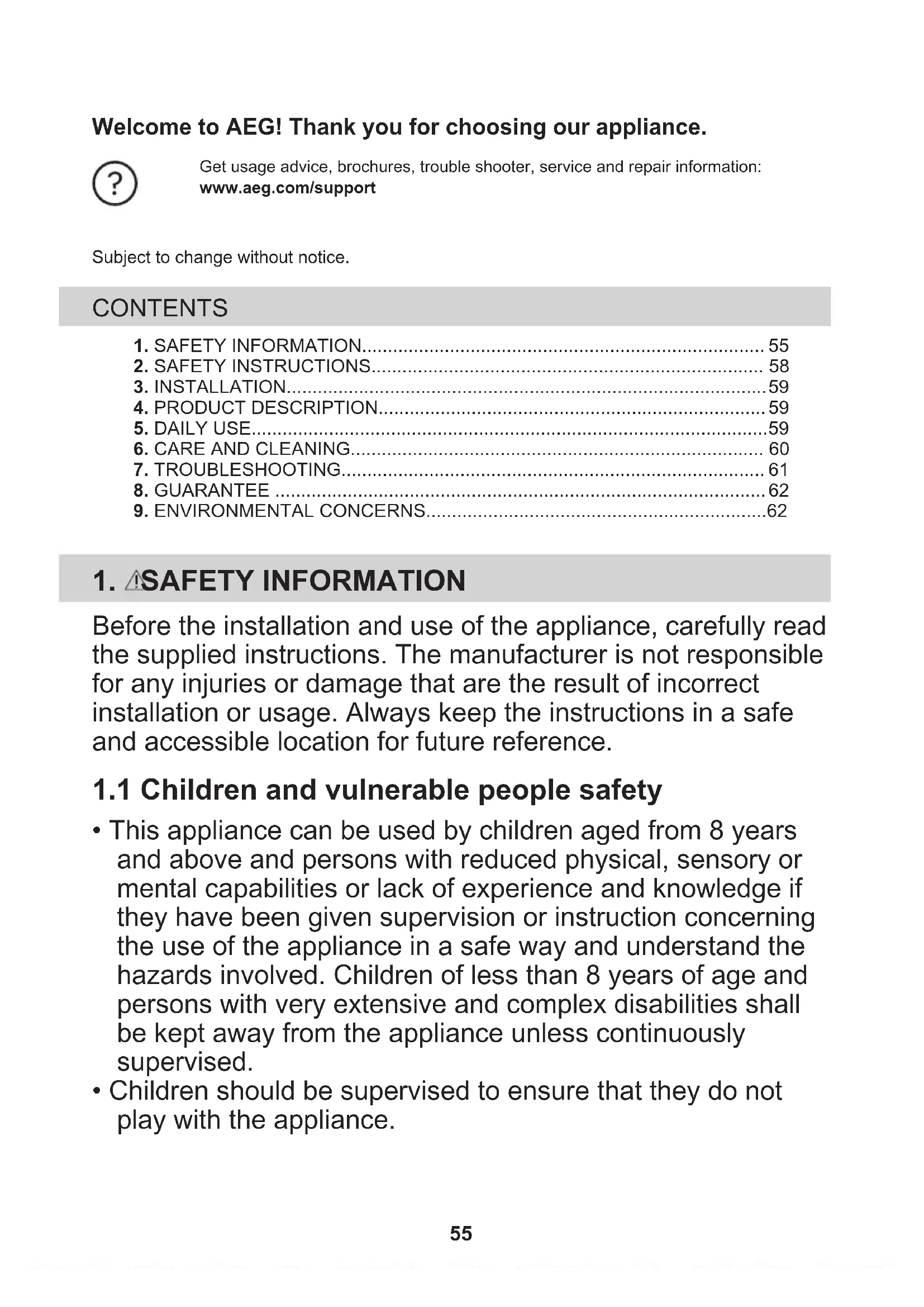 54Welcome to AEG! Thank you for choosing our appliance. Get usage advice, brochures, trouble shooter, service and repair information:www.aeg.com/supportSubject to change without notice. CONTENTS