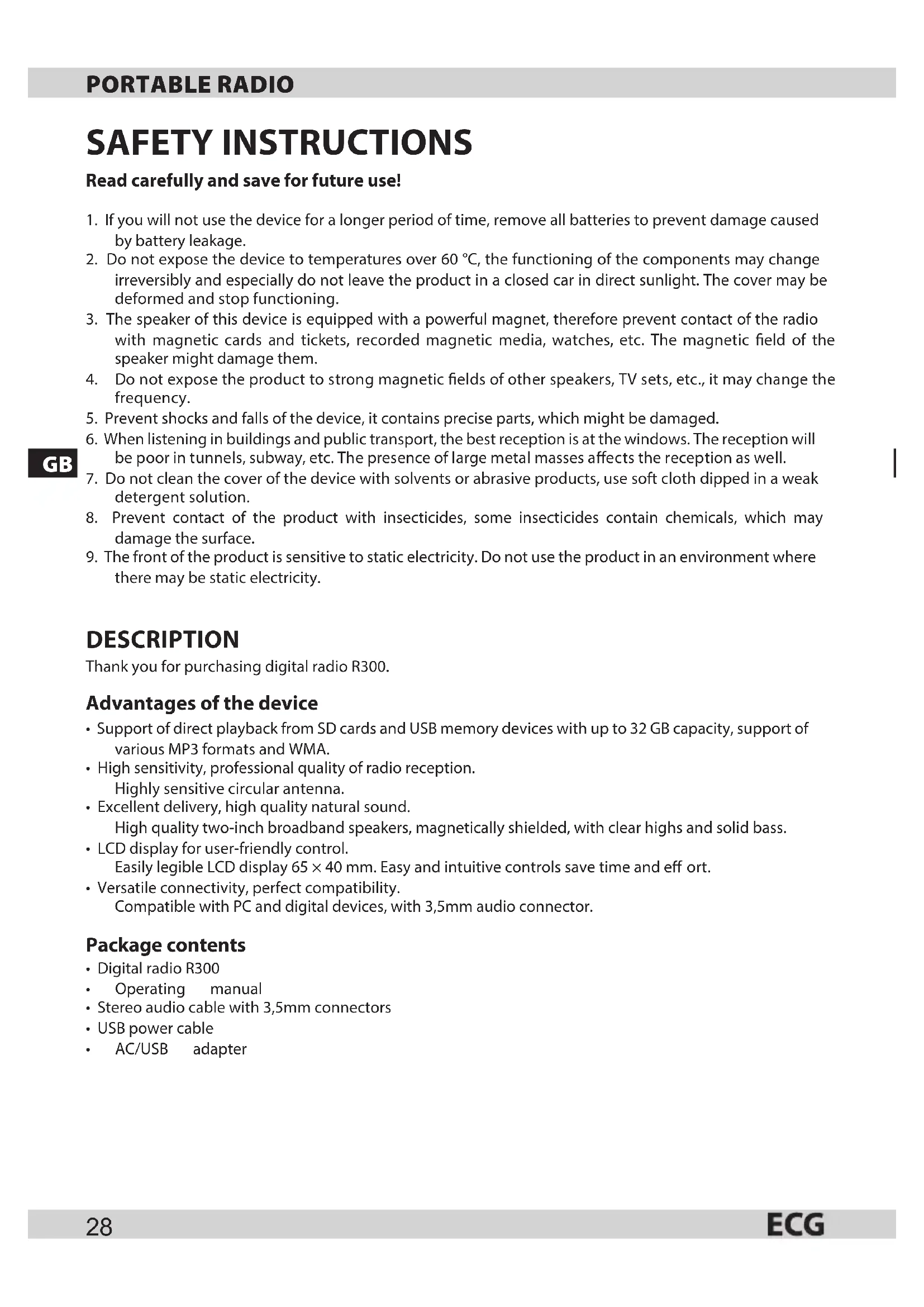 SAFETY INSTRUCTIONS Read carefully and save for future use! 1. If you will not use the device for a longer period of time, remove all batteries to prevent damage caused by battery leakage.2. Do not expose the device to temperatures over 60 °C, the functioning of the components may change irreversibly and especially do not leave the product in a closed car in direct sunlight. The cover may be deformed and stop functioning.3. The speaker of this device is equipped with a powerful magnet, therefore prevent contact of the radio with magnetic cards and tickets, recorded magnetic media, watches, etc. The magnetic eld of the speaker might damage them.
