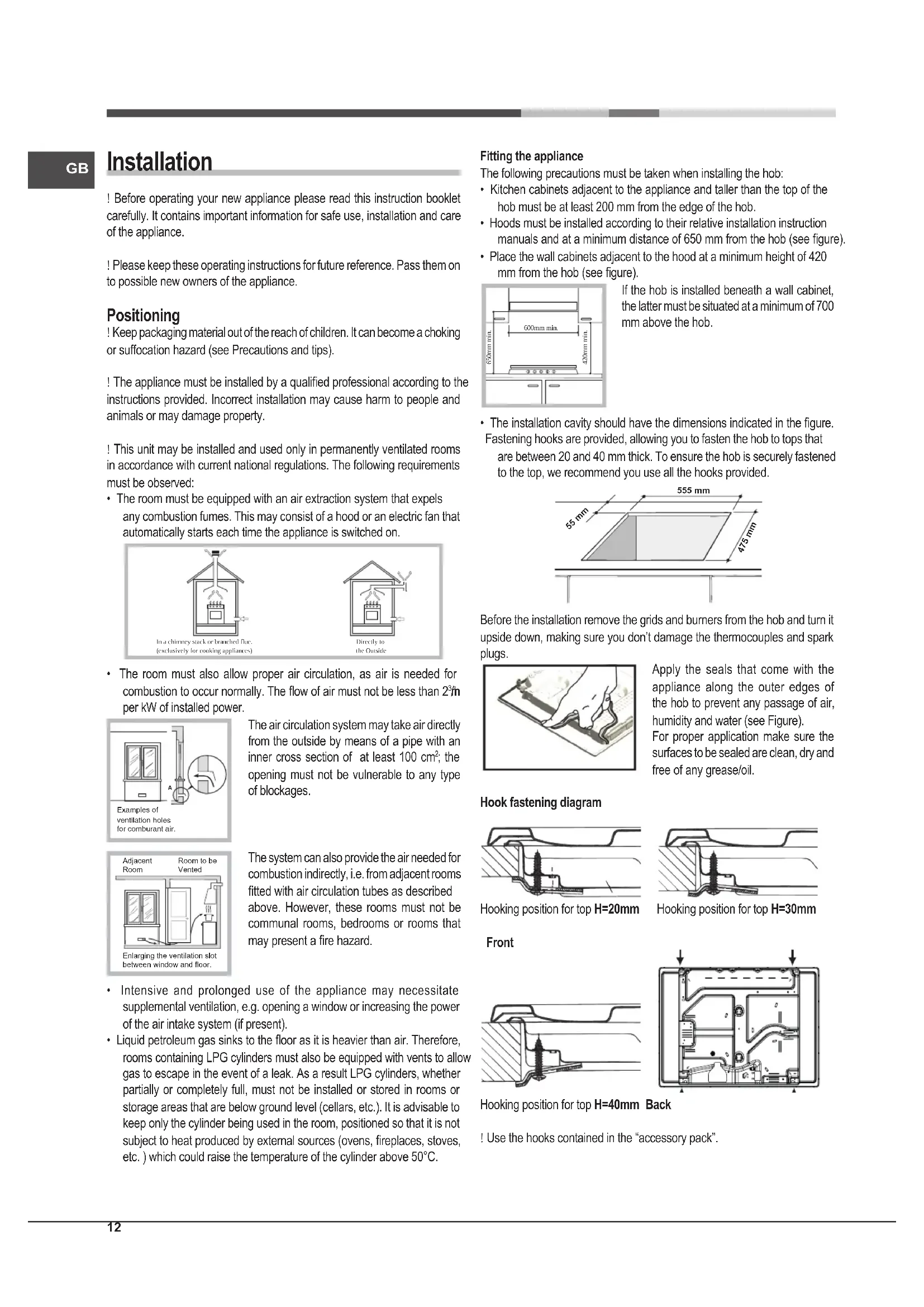 - The installation cavity should have the dimensions indicated in the gure. Fastening hooks are provided, allowing you to fasten the hob to tops that are between 20 and 40 mm thick. To ensure the hob is securely fastened to the top, we recommend you use all the hooks provided. 555 mm 55 mm 475 mm Before the installation remove the grids and burners from the hob and turn it upside down, making sure you don’t damage the thermocouples and spark plugs. Apply the seals that come with the appliance along the outer edges of the hob to prevent any passage of air, humidity and water (see Figure). For proper application make sure the surfaces to be sealed are clean, dry and free of any grease/oil. Hook fastening diagram Hooking position for top H=20mm Hooking position for top H=30mm Front Hooking position for top H=40mm Back ! Use the hooks contained in the “accessory pack”. 600mm min. 420mm min. 650mm min.GB