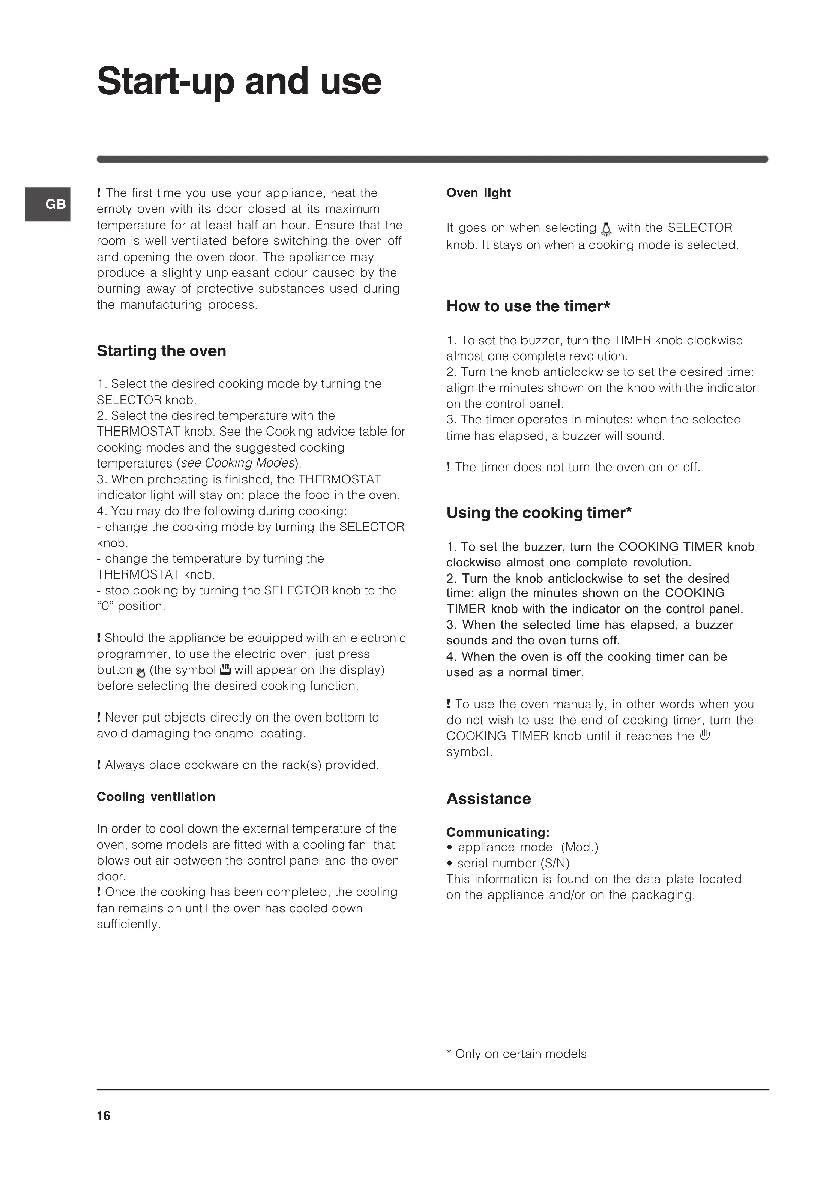 1. To set the buzzer, turn the TIMER knob clockwisealmost one complete revolution.2. Turn the knob anticlockwise to set the desired time:align the minutes shown on the knob with the indicatoron the control panel.3. The timer operates in minutes: when the selectedtime has elapsed, a buzzer will sound.! The timer does not turn the oven on or off. Using the cooking timer* 1. To set the buzzer, turn the COOKING TIMER knobclockwise almost one complete revolution.2. Turn the knob anticlockwise to set the desiredtime: align the minutes shown on the COOKINGTIMER knob with the indicator on the control panel.3. When the selected time has elapsed, a buzzersounds and the oven turns off.4. When the oven is off the cooking timer can beused as a normal timer.! To use the oven manually, in other words when youdo not wish to use the end of cooking timer, turn theCOOKING TIMER knob until it reaches the symbol. Assistance Communicating:• appliance model (Mod.)• serial number (S/N)This information is found on the data plate locatedon the appliance and/or on the packaging.* Only on certain models Start-up and use17