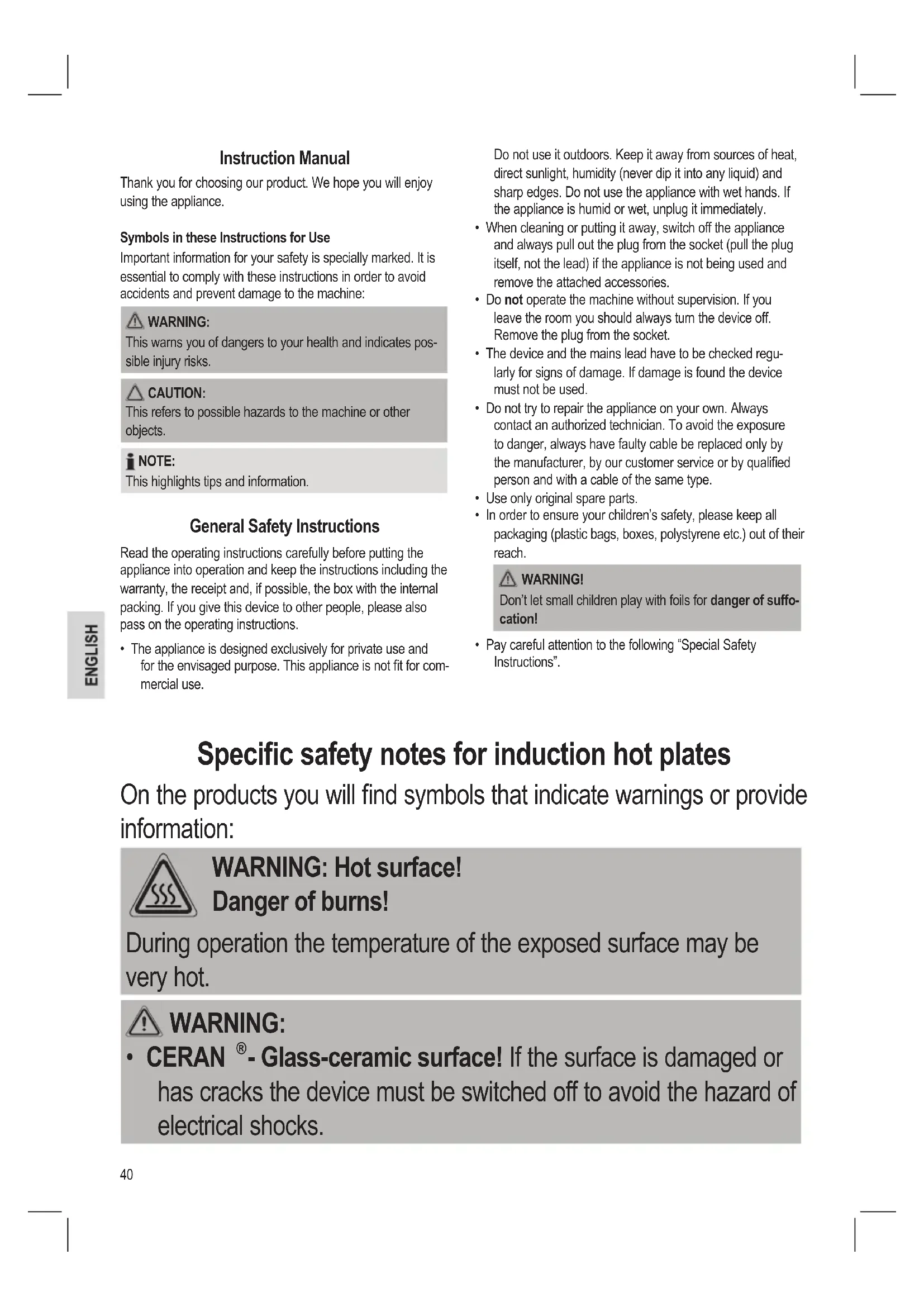 - Pay careful attention to the following “Special Safety Instructions”. Specic safety notes for induction hot plates On the products you will nd symbols that indicate warnings or provide information:
