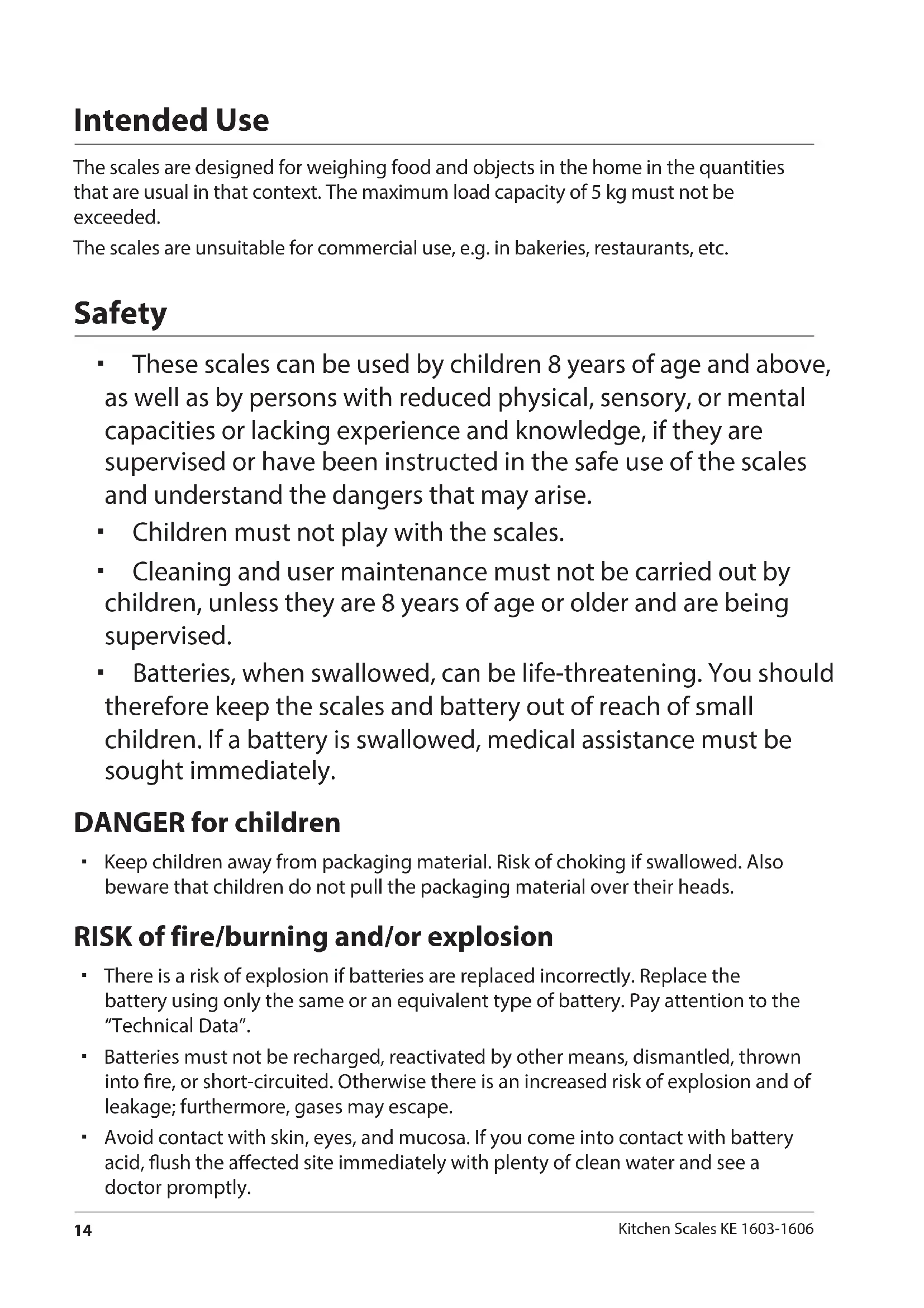 Kitchen Scales KE 1603-1606 Intended Use The scales are designed for weighing food and objects in the home in the quantities that are usual in that context. The maximum load capacity of 5 kg must not be exceeded. The scales are unsuitable for commercial use, e.g. in bakeries, restaurants, etc. Safety These scales can be used by children 8 years of age and above, as well as by persons with reduced physical, sensory, or mental capacities or lacking experience and knowledge, if they are supervised or have been instructed in the safe use of the scales and understand the dangers that may arise. Children must not play with the scales. Cleaning and user maintenance must not be carried out by children, unless they are 8 years of age or older and are being supervised. Batteries, when swallowed, can be life-threatening. You should therefore keep the scales and battery out of reach of small children. If a battery is swallowed, medical assistance must be sought immediately. DANGER for children Keep children away from packaging material. Risk of choking if swallowed. Also beware that children do not pull the packaging material over their heads. RISK of fire/burning and/or explosion There is a risk of explosion if batteries are replaced incorrectly. Replace the battery using only the same or an equivalent type of battery. Pay attention to the “Technical Data”. Batteries must not be recharged, reactivated by other means, dismantled, thrown into re, or short-circuited. Otherwise there is an increased risk of explosion and of leakage; furthermore, gases may escape. Avoid contact with skin, eyes, and mucosa. If you come into contact with battery acid, ush the aected site immediately with plenty of clean water and see a doctor promptly. Druckbuch Kuechenwaagen DIV.indb 14 13.04.2016 13:19:37Safety