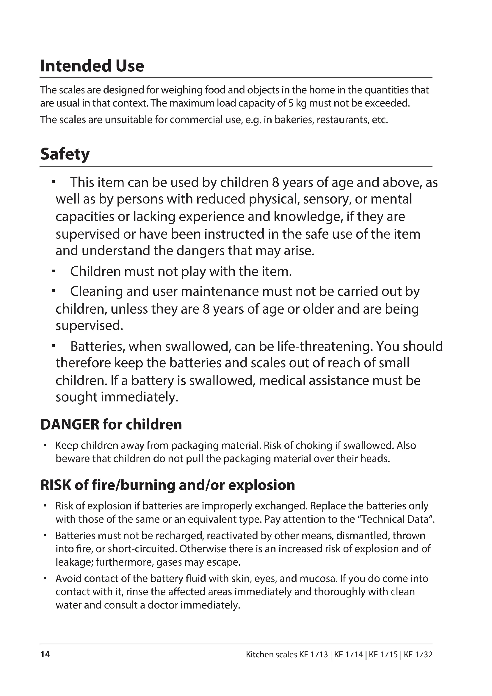Kitchen scales KE 1713 | KE 1714 | KE 1715 | KE 1732 Intended Use The scales are designed for weighing food and objects in the home in the quantities that are usual in that context. The maximum load capacity of 5 kg must not be exceeded. The scales are unsuitable for commercial use, e.g. in bakeries, restaurants, etc. Safety This item can be used by children 8 years of age and above, as well as by persons with reduced physical, sensory, or mental capacities or lacking experience and knowledge, if they are supervised or have been instructed in the safe use of the item and understand the dangers that may arise. Children must not play with the item. Cleaning and user maintenance must not be carried out by children, unless they are 8 years of age or older and are being supervised. Batteries, when swallowed, can be life-threatening. You should therefore keep the batteries and scales out of reach of small children. If a battery is swallowed, medical assistance must be sought immediately. DANGER for children Keep children away from packaging material. Risk of choking if swallowed. Also beware that children do not pull the packaging material over their heads. RISK of fire/burning and/or explosion Risk of explosion if batteries are improperly exchanged. Replace the batteries only with those of the same or an equivalent type. Pay attention to the “Technical Data”. Batteries must not be recharged, reactivated by other means, dismantled, thrown into re, or short-circuited. Otherwise there is an increased risk of explosion and of leakage; furthermore, gases may escape. Avoid contact of the battery uid with skin, eyes, and mucosa. If you do come into contact with it, rinse the aected areas immediately and thoroughly with clean water and consult a doctor immediately.Safety