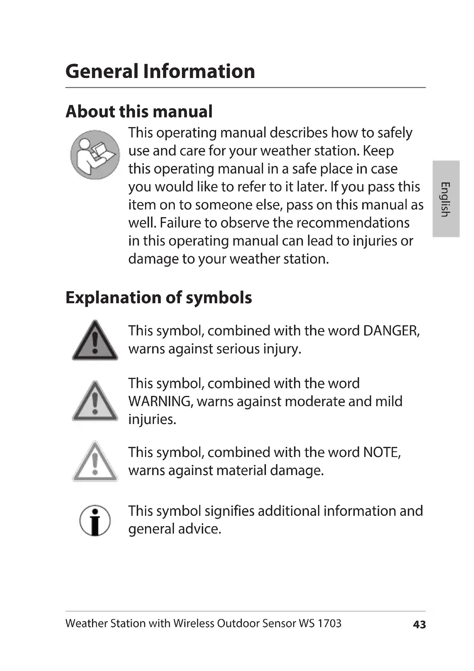the mains adaptor. FW Station.indb 71 26.04.2017 10:02:4772 Weather Station with Wireless Outdoor Sensor WS 1703 Fault/Remedy Fault Possible Cause The DCF77 signal for the time cannot be received. Check the chosen location. Start the signal reception manually, if necessary. Adjust the time manually. The temperature information of the sensor seems too high. Check whether the sensor has been exposed to direct sunlight. Instead of showing the measured values for temperature or humidity, the display shows H.HH or LL.L. The values lie above or below the measurement range. The temperature indicator is blinking on the display. The temperature alert has triggered. Press on ALERT as often as needed until the blinking stops. The indicator is illegible, the function is unclear, or the values are obviously false. Reset the weather station to the original delivery state. FW Station.indb 72 26.04.2017 10:02:4773 Weather Station with Wireless Outdoor Sensor WS 1703 English Fault Possible Cause The base station is not receiving signals from the wireless sensor. Ensure that no electrical sources of interference are located in the vicinity of the wireless sensor or of the base station. Check the batteries in the sensor. Move the base station closer to the sensor, or vice versa. The time differs by exactly one, two, three, etc. hours. You have probably set an incorrect time zone. FW Station.indb 73 26.04.2017 10:02:4774 Weather Station with Wireless Outdoor Sensor WS 1703 Technical Data Base station Model: Weather Station WS 1703 Input: 4.5 V Batteries: 2x LR6 (AA)/1.5 V Measuring range - Temperature: 0 °C - 60 °C (32 °F - 140 °F) - Air pressure: 600 hPa/mb-1100 hPa/mb or17.72 inHg-32.50 inHg or450.0 mmHg-825.0 mmHg - Humidity: 20% - 95% Wireless outdoor sensor Batteries: 2x R03 (AAA)/1.5 V Measuring range: - Temperature: -20 °C - 60 °C (-4 °F - 140 °F) - Air pressure: like base station - Humidity: like base station Transmission frequency: 433.92 MHz Range: approx. 60 metres (open terrain) Mains adaptor Input: 230 V ~ 50Hz Output: 4.5 V /200 mA Protection class: