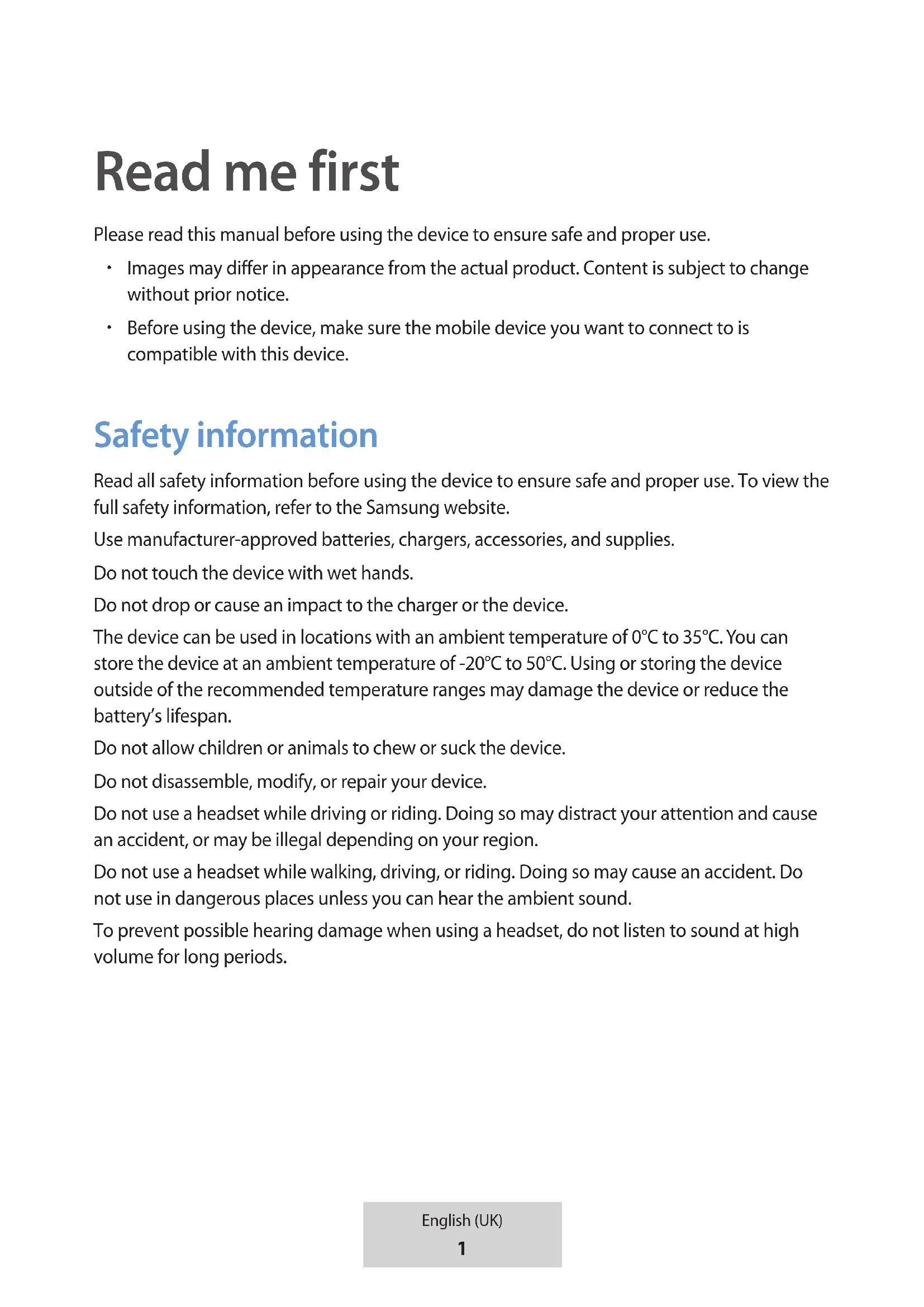 Before using the device, make sure the mobile device you want to connect to is compatible with this device. Safety information Read all safety information before using the device to ensure safe and proper use. To view the full safety information, refer to the Samsung website. Use manufacturer-approved batteries, chargers, accessories, and supplies. Do not touch the device with wet hands. Do not drop or cause an impact to the charger or the device. The device can be used in locations with an ambient temperature of 0°C to 35°C. You can store the device at an ambient temperature of -20°C to 50°C. Using or storing the device outside of the recommended temperature ranges may damage the device or reduce the battery’s lifespan. Do not allow children or animals to chew or suck the device. Do not disassemble, modify, or repair your device. Do not use a headset while driving or riding. Doing so may distract your attention and cause an accident, or may be illegal depending on your region. Do not use a headset while walking, driving, or riding. Doing so may cause an accident. Do not use in dangerous places unless you can hear the ambient sound. To prevent possible hearing damage when using a headset, do not listen to sound at high volume for long periods.2