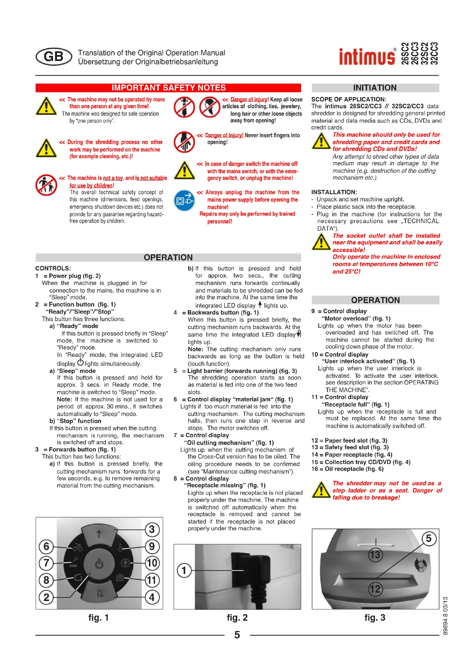 Papier / CD,DVD Papier / CD,DVD EIN / AUS B x T x H intimus 26SC2 276-4S 4 mm / 8 mm 13 Blatt* / 1 Stück 240 mm ca. 55 dB(A) 10 / 45 min 390 x 330 x 550 mm 16 kg intimus 26CC3 276-4C 4x28 mm / 8 mm 9 Blatt* / 1 Stück 240 mm ca. 55 dB(A) 10 / 45 min 390 x 330 x 550 mm 16,2 kg intimus 32SC2 277-4S 4 mm / 8 mm 17 Blatt* / 1 Stück 240 mm ca. 55 dB(A) 10 / 45 min 390 x 360 x 600 mm 16,5 kg intimus 32CC3 277-4C 4x28 mm / 8 mm 12 Blatt* / 1 Stück 240 mm ca. 55 dB(A) 10 / 45 min 390 x 360 x 600 mm 16,7 kg Vorsicherung (träge): 220-240V = 10 A / 120V = 15 A Anschlußspannung/Frequenz · Stromaufnahme · Leistung intimus 26SC2 220-240V/50Hz · 1,7 A · 0,39 KW 120V/60Hz · 2,9 A · 0,35 KW intimus 26CC3 220-240V/50Hz · 1,7 A · 0,39 KW 120V/60Hz · 2,9 A · 0,35 KW intimus 32SC2 220-240V/50Hz · 1,9 A · 0,44 KW 120V/60Hz · 3,5 A · 0,42 KW intimus 32CC3 220-240V/50Hz · 1,9 A · 0,44 KW 120V/60Hz · 3,5 A · 0,42 KW<< The machine may not be operated by more than one person at any given time! The machine was designed for safe operation by “one person only”.<< During the shredding process no other work may be performed on the machine (forexamplecleaning,etc.)!<< The machine is not a toy, and is not suitable for use by children! The overall technical safety concept of this machine (dimensions, feed openings, emergency shutdown devices etc.) does not provide for any guarantee regarding hazard-free operation by children.<< Danger of injury! Keep all loose articles of clothing, ties, jewelery, long hair or other loose objects away from opening!<< Danger of injury!Neverinsertngersintoopening!<< In case of danger switch the machine off with the mains switch, or with the emer-gency switch, or unplug the machine!<< Always unplug the machine from the mains power supply before opening the machine! Repairs may only be performed by trained personnel! IMPORTANTSAFETYNOTES 9 = Control display “Motoroverload”(g.1) Lights up when the motor has been overloaded and has switched off. The machine cannot be started during the cooling down phase of the motor.10 = Control display “Userinterlockactivated”(g.1) Lights up when the user interlock is activated. To activate the user interlock, see description in the section “OPERATING THE MACHINE 11 = Control display “Receptaclefull”(g.1) Lights up when the receptacle is full and must be replaced. At the same time the machine is automatically switched off.12=Paperfeedslot(g.3)13=Safetyfeedslot(g.3)14=Paperreceptacle(g.4)15=CollectiontrayCD/DVD(g.4)16=Oilreceptacle(g.6)The shredder may not be used as a step ladder or as a seat. Danger of falling due to breakage!CONTROLS:1 =Powerplug(g.2) When the machine is plugged in for connection to the mains, the machine is in “Sleep” mode.2 =Functionbutton(g.1) “Ready”/”Sleep”/”Stop” This button has three functions: a) “Ready”mode If this button is pressed briey in “Sleep” mode, the machine is switched to “Ready” mode. In “Ready” mode, the integrated LED display lights simultaneously. a) “Sleep”mode If this button is pressed and held for approx. 3 secs. in Ready mode, the machine is switched to “Sleep” mode. Note: If the machine is not used for a period of approx. 30 mins., it switches automatically to “Sleep” mode. b) “Stop”function If this button is pressed when the cutting mechanism is running, the mechanism is switched off and stops.3 =Forwardsbutton(g.1) This button has two functions: a) If this button is pressed briey, the cutting mechanism runs forwards for a few seconds, e.g. to remove remaining material from the cutting mechanism. b) If this button is pressed and held for approx. two secs., the cutting mechanism runs forwards continually and materials to be shredded can be fed into the machine. At the same time the integrated LED display lights up.4 =Backwardsbutton(g.1) When this button is pressed briey, the cutting mechanism runs backwards. At the same time the integrated LED display lights up. Note: The cutting mechanism only runs backwards as long as the button is held (touch function).5 =Lightbarrier(forwardsrunning)(g.3) The shredding operation starts as soon as material is fed into one of the two feed slots.6 =Controldisplay“materialjam“(g.1) Lights if too much material is fed into the cutting mechanism. The cutting mechanism halts, then runs one step in reverse and stops. The motor switches off.7 = Control display “Oilcuttingmechanism”(g.1) Lights up when the cutting mechanism of the Cross-Cut version has to be oiled. The oiling procedure needs to be conrmed (see “Maintenance cutting mechanism”).8 = Control display “Receptaclemissing”(g.1) Lights up when the receptacle is not placed properly under the machine. The machine is switched off automatically when the receptacle is removed and cannot be started if the receptacle is not placed properly under the machine.SCOPEOFAPPLICATION: The intimus 26SC2/CC3 // 32SC2/CC3 data shredder is designed for shredding general printed material and data media such as CDs, DVDs and credit cards.This machine should only be used for shredding paper and credit cards and for shredding CDs and DVDs!Any attempt to shred other types of data medium may result in damage to the machine (e.g. destruction of the cutting mechanism etc.).INSTALLATION:- Unpack and set machine upright.- Place plastic sack into the receptacle.- Plug in the machine (for instructions for the necessary precautions see „TECHNICAL DATA“).The socket outlet shall be installed near the equipment and shall be easily accessible!Only operate the machine in enclosed rooms at temperatures between 10°C and 25°C!
