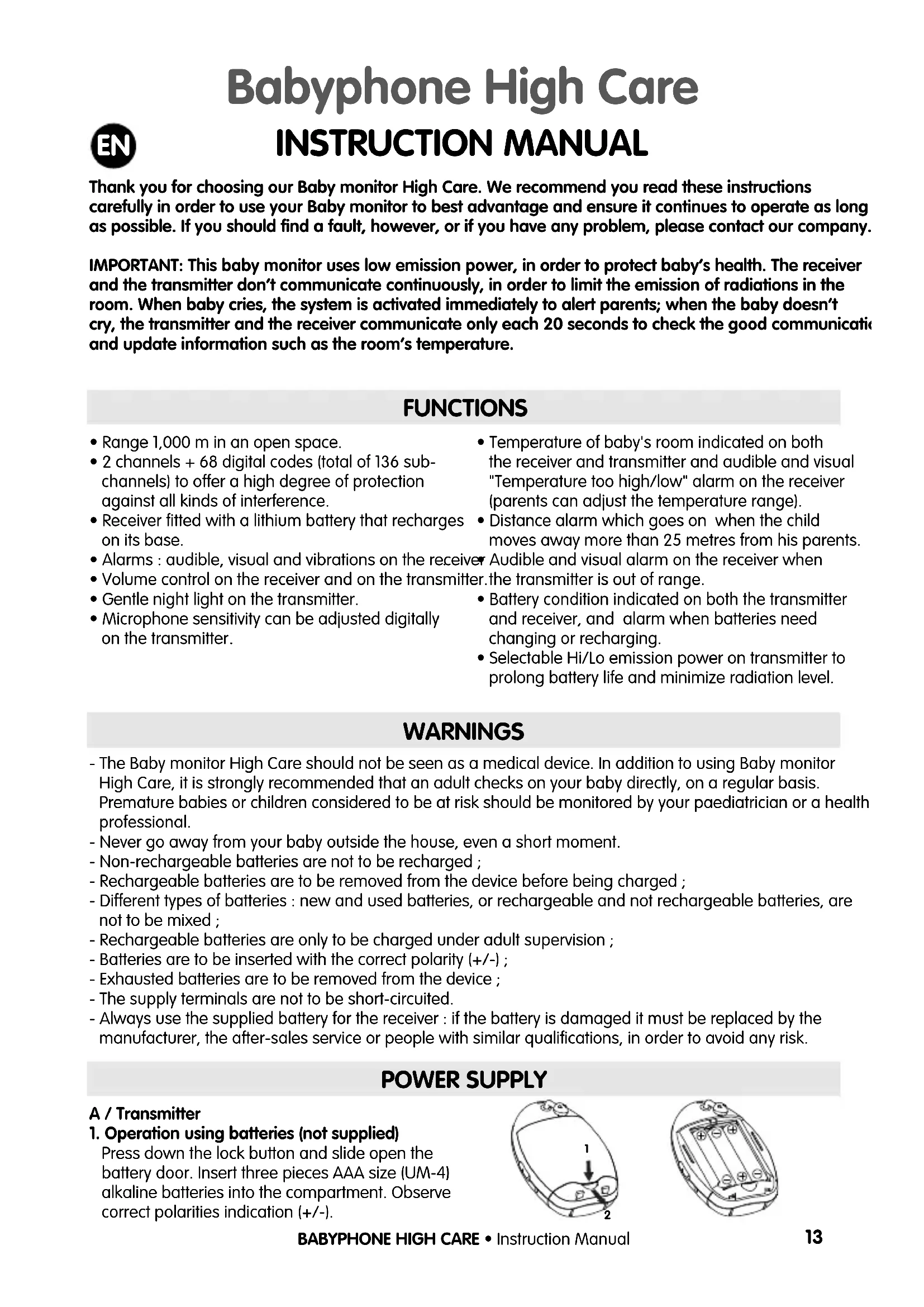 - Temperature of baby's room indicated on boththe receiver and transmitter and audible and visual"Temperature too high/low" alarm on the receiver(parents can adjust the temperature range).• Distance alarm which goes on when the childmoves away more than 25 metres from his parents.• Audible and visual alarm on the receiver whenthe transmitter is out of range.• Battery condition indicated on both the transmitterand receiver, and alarm when batteries needchanging or recharging.• Selectable Hi/Lo emission power on transmitter toprolong battery life and minimize radiation level.BABYPHONE HIGH CARE • Instruction Manual INSTRUCTION MANUAL WARNINGS - The Baby monitor High Care should not be seen as a medical device. In addition to using Baby monitorHigh Care, it is strongly recommended that an adult checks on your baby directly, on a regular basis.Premature babies or children considered to be at risk should be monitored by your paediatrician or a healthprofessional. - Never go away from your baby outside the house, even a short moment.- Non-rechargeable batteries are not to be recharged ;- Rechargeable batteries are to be removed from the device before being charged ;- Different types of batteries : new and used batteries, or rechargeable and not rechargeable batteries, arenot to be mixed ;- Rechargeable batteries are only to be charged under adult supervision ;- Batteries are to be inserted with the correct polarity (+/-) ; - Exhausted batteries are to be removed from the device ; - The supply terminals are not to be short-circuited. - Always use the supplied battery for the receiver : if the battery is damaged it must be replaced by themanufacturer, the after-sales service or people with similar qualifications, in order to avoid any risk. POWER SUPPLY A / Transmitter1. Operation using batteries (not supplied)Press down the lock button and slide open thebattery door. Insert three pieces AAA size (UM-4)alkaline batteries into the compartment. Observecorrect polarities indication (+/-). Babyphone High Care