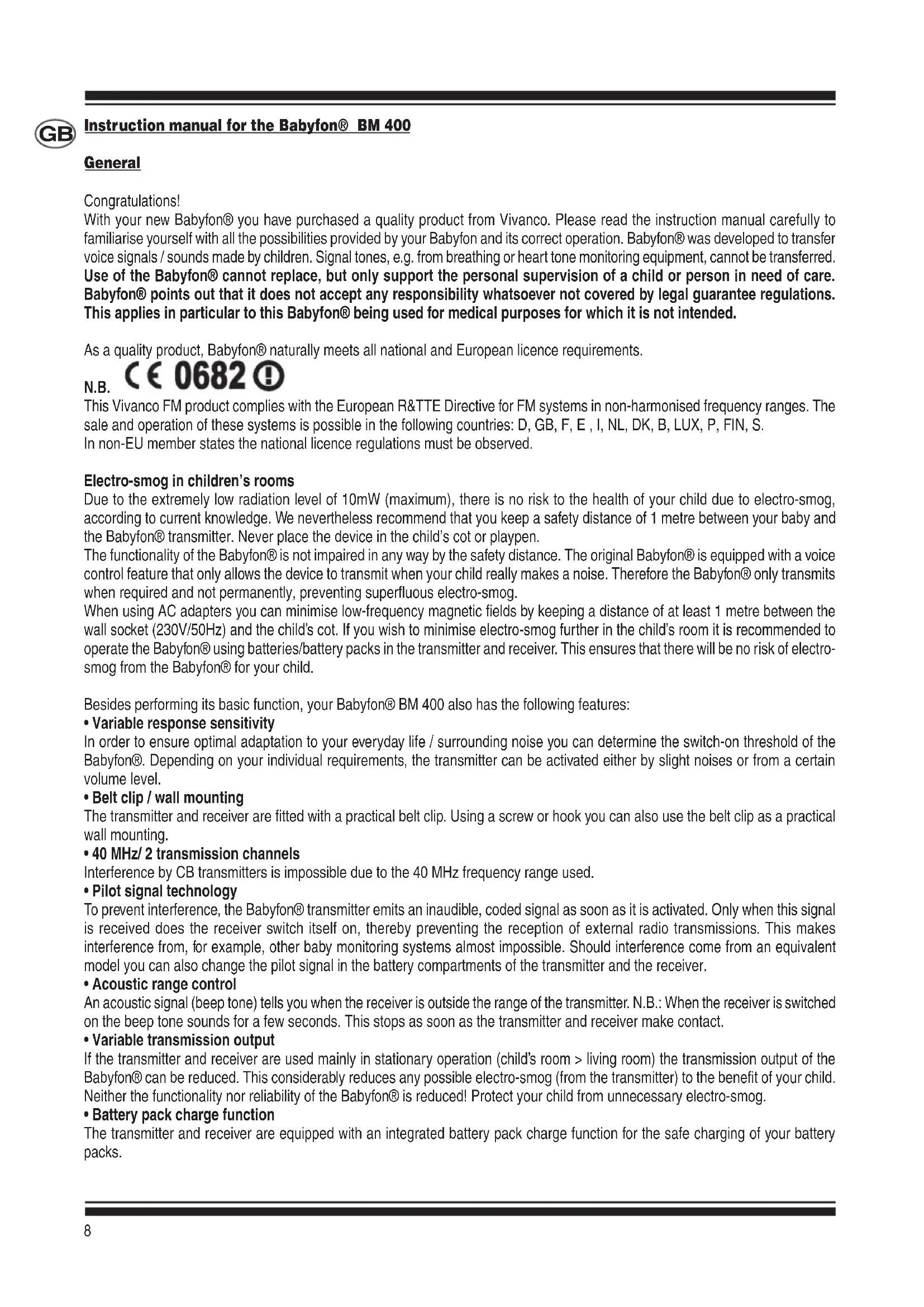 Anzahl Kanäle: 2 Frequenzen: Kanal A: 40,68 MHz Kanal B: 40,69 MHz Stromversorgung: Sender: Steckernetzteil 6 Volt/ 200mA oder 3 Mignon -Zellen (AA) Empfänger: Steckernetzteil 6 Volt/ 200mA oder 3 Mignon -Zellen (AA) Sendeleistung: Max. 10 mW Die Garantiezeit beträgt 24 Monate ab Kaufdatum. Technische Änderungen vorbehalten! Babyfon® is a registered trademark of Vivanco Germany.8 Instr uction manual for the Babyfon® BM 400 General Congratulations! With your new Babyfon® you have purchased a quality product from Vivanco. Please read the instruction manual carefully to familiarise yourself with all the possibilities provided by your Babyfon and its correct operation. Babyfon® was developed to transfer voice signals / sounds made by children. Signal tones, e.g. from breathing or heart tone monitoring equipment, cannot be transferred. Use of the Babyfon® cannot replace, but only support the personal supervision of a child or person in need of care. Babyfon® points out that it does not accept any responsibility whatsoever not covered by legal guarantee regulations. This applies in particular to this Babyfon® being used for medical purposes for which it is not intended. As a quality product, Babyfon® naturally meets all national and European licence requirements. N.B. This Vivanco FM product complies with the European R&TTE Directive for FM systems in non-harmonised frequency ranges. The sale and operation of these systems is possible in the following countries: D, GB, F, E , I, NL, DK, B, LUX, P, FIN, S. In non-EU member states the national licence regulations must be observed. Electro-smog in children’s rooms Due to the extremely low radiation level of 10mW (maximum), there is no risk to the health of your child due to electro-smog, according to current knowledge. We nevertheless recommend that you keep a safety distance of 1 metre between your baby and the Babyfon® transmitter. Never place the device in the child’s cot or playpen. The functionality of the Babyfon® is not impaired in any way by the safety distance. The original Babyfon® is equipped with a voice control feature that only allows the device to transmit when your child really makes a noise. Therefore the Babyfon® only transmits when required and not permanently, preventing superfluous electro-smog. When using AC adapters you can minimise low-frequency magnetic fields by keeping a distance of at least 1 metre between the wall socket (230V/50Hz) and the child’s cot. If you wish to minimise electro-smog further in the child’s room it is recommended to operate the Babyfon® using batteries/battery packs in the transmitter and receiver. This ensures that there will be no risk of electro- smog from the Babyfon® for your child. Besides performing its basic function, your Babyfon® BM 400 also has the following features: