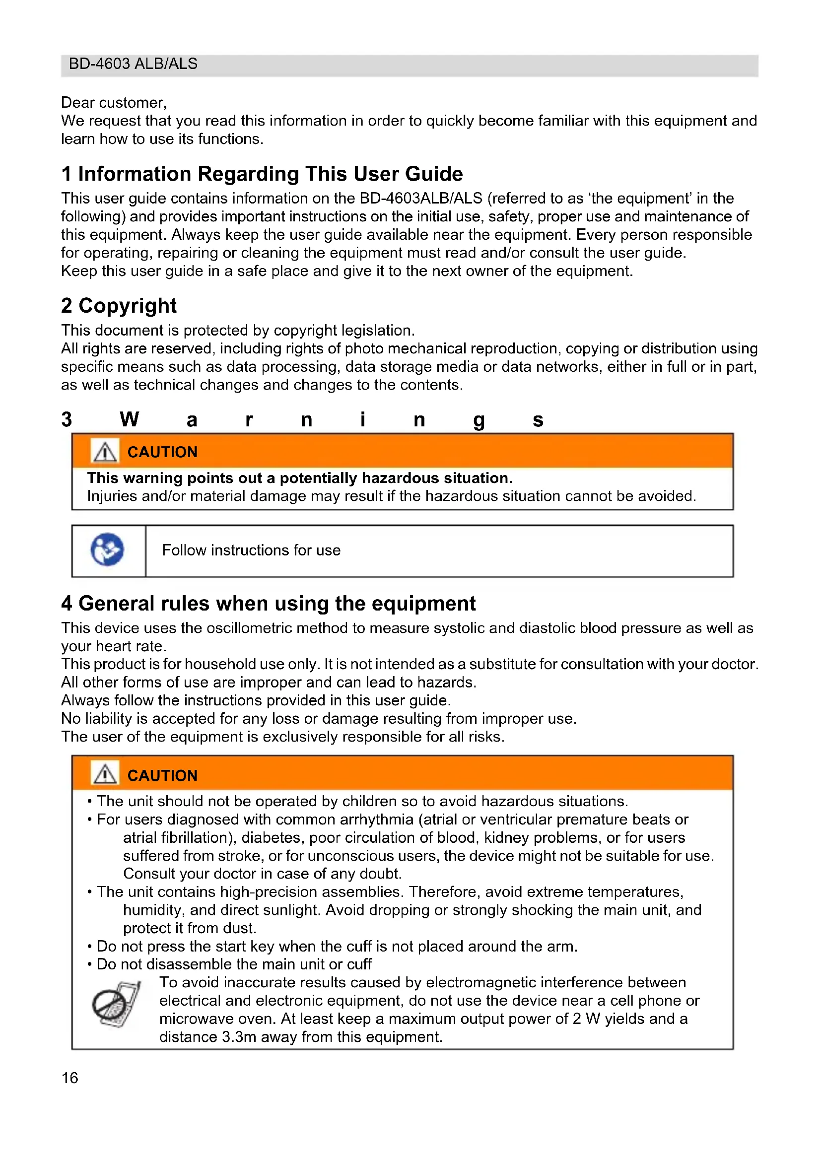 Dear customer, We request that you read this information in order to quickly become familiar with this equipment and learn how to use its functions. 1 Information Regarding This User Guide This user guide contains information on the BD-4603ALB/ALS (referred to as ‘the equipment’ in the following) and provides important instructions on the initial use, safety, proper use and maintenance of this equipment. Always keep the user guide available near the equipment. Every person responsible for operating, repairing or cleaning the equipment must read and/or consult the user guide. Keep this user guide in a safe place and give it to the next owner of the equipment. 2 Copyright This document is protected by copyright legislation. All rights are reserved, including rights of photo mechanical reproduction, copying or distribution using specific means such as data processing, data storage media or data networks, either in full or in part, as well as technical changes and changes to the contents. 3Warnings 4 General rules when using the equipment This device uses the oscillometric method to measure systolic and diastolic blood pressure as well as your heart rate. This product is for household use only. It is not intended as a substitute for consultation with your doctor. All other forms of use are improper and can lead to hazards. Always follow the instructions provided in this user guide. No liability is accepted for any loss or damage resulting from improper use. The user of the equipment is exclusively responsible for all risks. CAUTION This warning points out a potentially hazardous situation. Injuries and/or material damage may result if the hazardous situation cannot be avoided. Follow instructions for use CAUTION