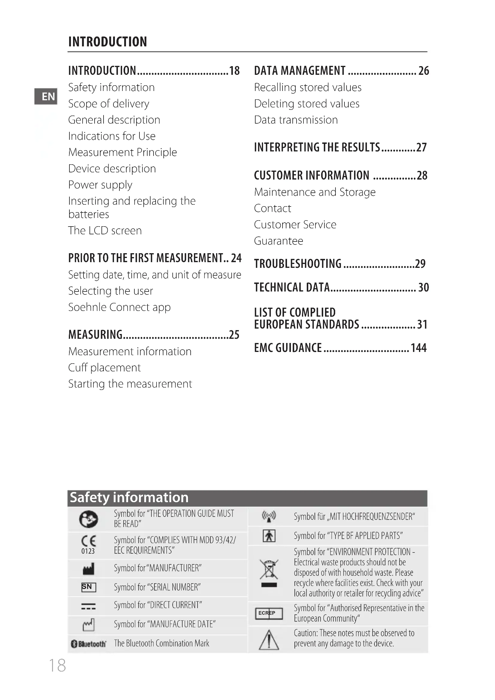 EUROPEAN STANDARDS ................... 31 EMC GUIDANCE .............................. 144 Symbol for “THE OPERATION GUIDE MUST BE READ”0123Symbol for “COMPLIES WITH MDD 93/42/EEC REQUIREMENTS”Symbol for “MANUFACTURER” Symbol for “SERIAL NUMBER”Symbol for “DIRECT CURRENT”Symbol for “MANUFACTURE DATE”The Bluetooth Combination MarkSymbol für „MIT HOCHFREQUENZSENDER“Symbol for “TYPE BF APPLIED PARTS”Symbol for “ENVIRONMENT PROTECTION - Electrical waste products should not be disposed of with household waste. Please recycle where facilities exist. Check with your local authority or retailer for recycling advice”EC REPSymbol for “Authorised Representative in the European Community“Caution: These notes must be observed to prevent any damage to the device. Safety informationEN