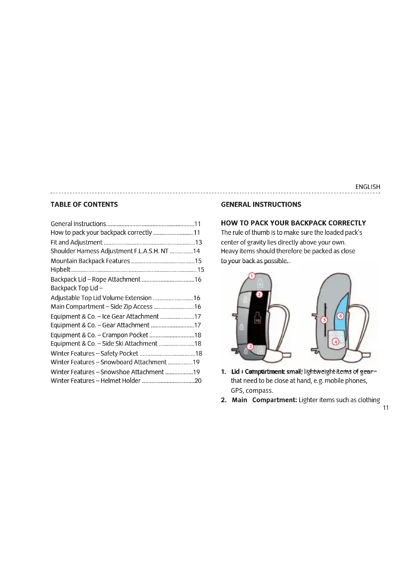 - Winter Features – Helmet Holder ENGLISH should be packed at the bottom, top and on the sides. Heavier items such as climbing equipment (carabiners, wedges, quickdraws), the tent, tinned food or water supplies should be packed in the middle, close in to your back. p. 2012