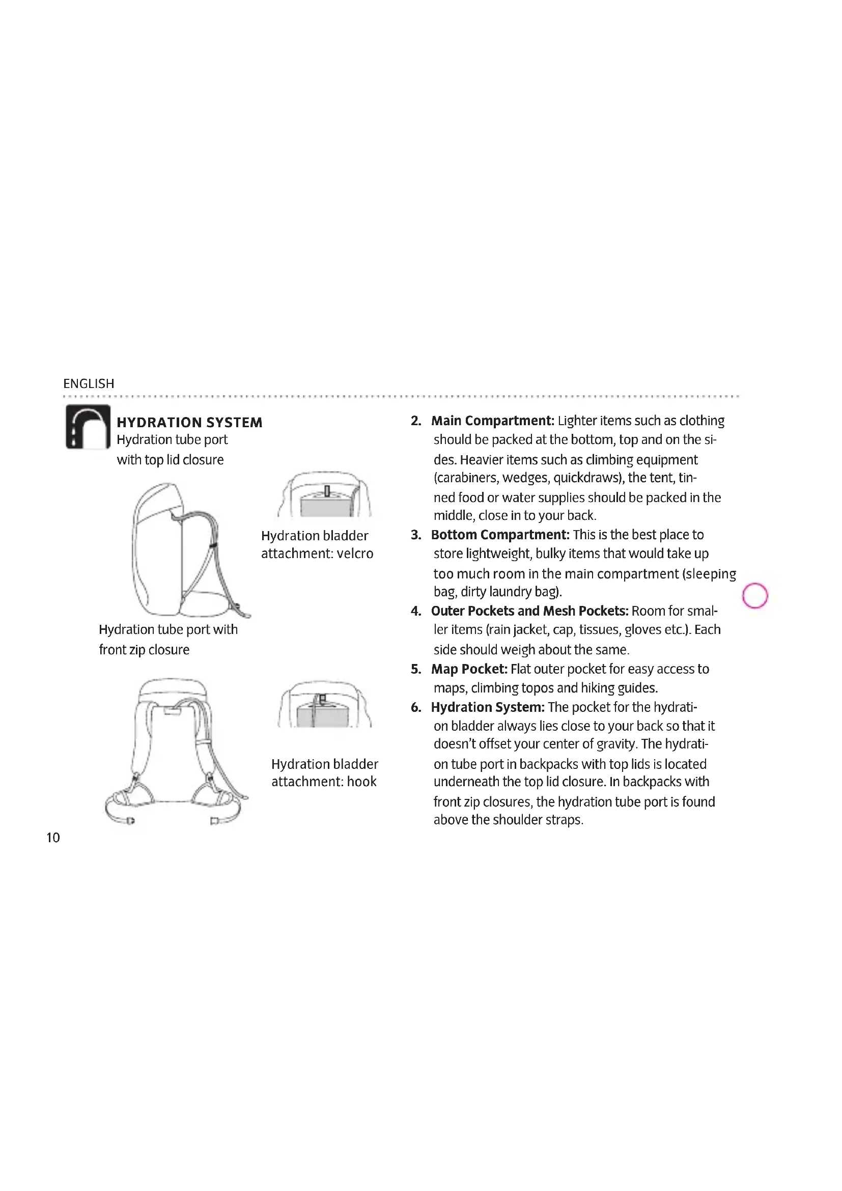 should be packed at the bottom, top and on the si- des. Heavier items such as climbing equipment (carabiners, wedges, quickdraws), the tent, tin- ned food or water supplies should be packed in the middle, close in to your back.