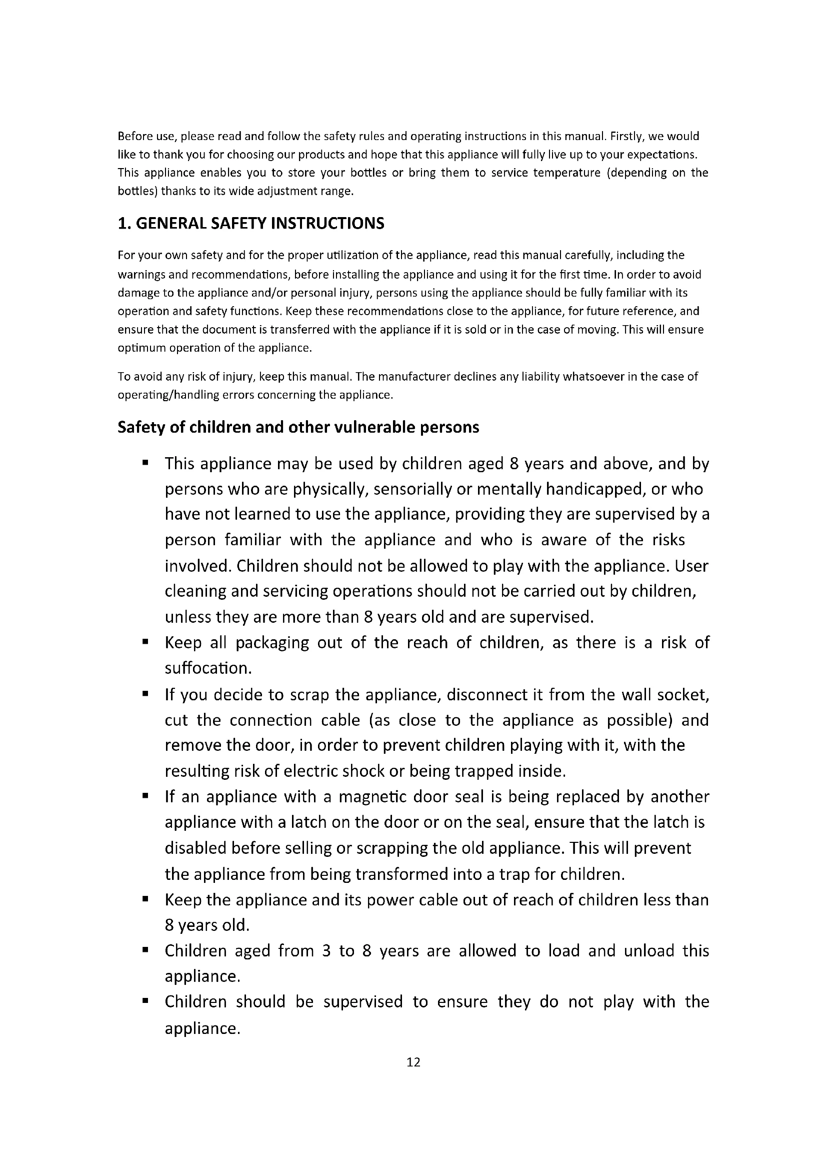 Installation type Pose libre12 Before use, please read and follow the safety rules and operating instructions in this manual. Firstly, we would like to thank you for choosing our products and hope that this appliance will fully live up to your expectations. This appliance enables you to store your bottles or bring them to service temperature (depending on the bottles) thanks to its wide adjustment range.
