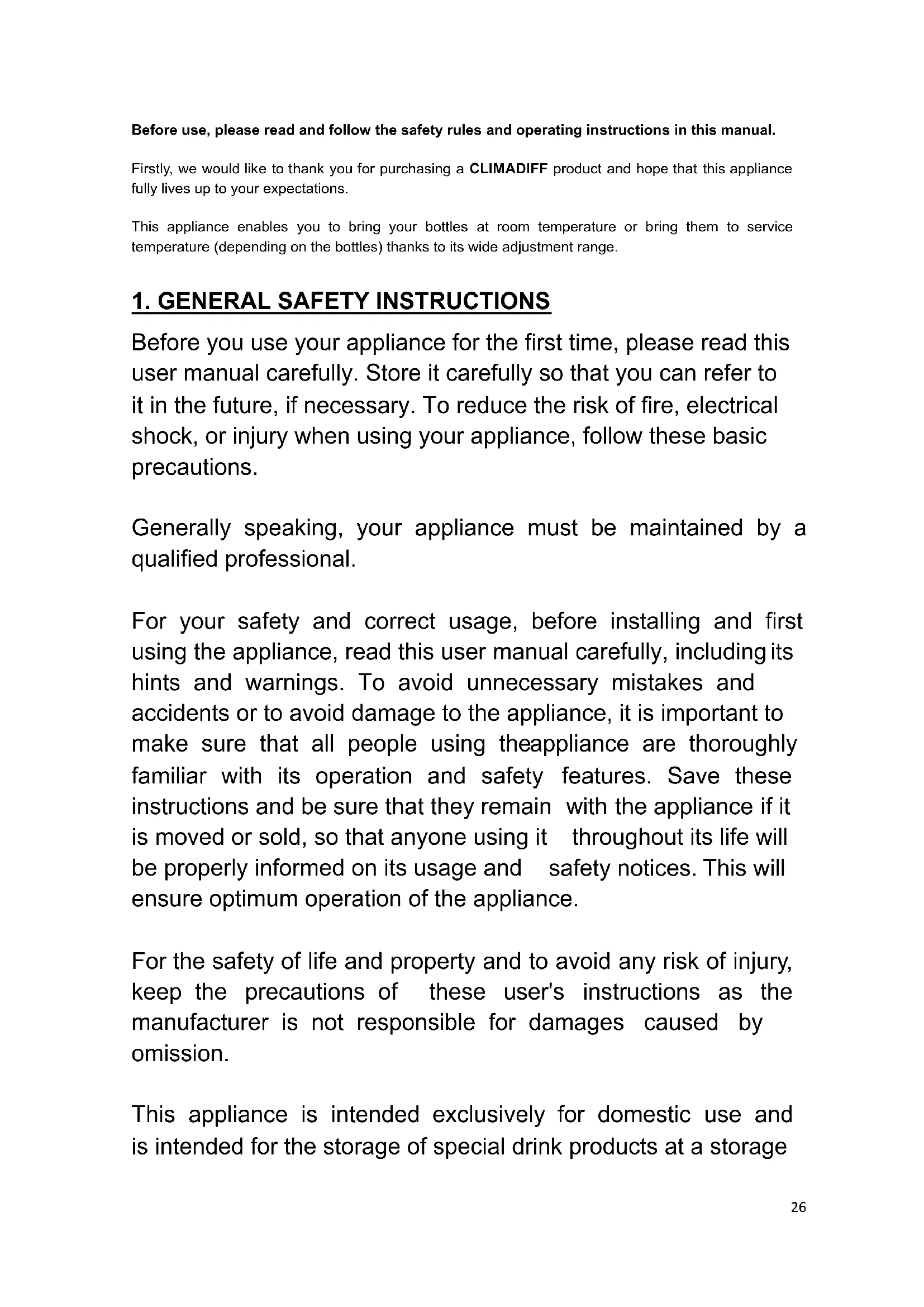 Before you use your appliance for the first time, please read this user manual carefully. Store it carefully so that you can refer to it in the future, if necessary. To reduce the risk of fire, electrical shock, or injury when using your appliance, follow these basic precautions. Generally speaking, your appliance must be maintained by a qualified professional. For your safety and correct usage, before installing and first using the appliance, read this user manual carefully, including its hints and warnings. To avoid unnecessary mistakes and accidents or to avoid damage to the appliance, it is important to make sure that all people using the appliance are thoroughly familiar with its operation and safety features. Save these instructions and be sure that they remain with the appliance if it is moved or sold, so that anyone using it throughout its life will be properly informed on its usage and safety notices. This will ensure optimum operation of the appliance. For the safety of life and property and to avoid any risk of injury, keep the precautions of these user's instructions as the manufacturer is not responsible for damages caused by omission. This appliance is intended exclusively for domestic use and is intended for the storage of special drink products at a storage27 temperature higher than that of a storage compartment for fresh products. Under no circumstances is it intended to keep products fresh. Make sure that your electrical installation's voltage corresponds to that on the appliance’s nameplate; the appliance must be connected to an approved, earthed system. Incorrect repairs or connections can cause safety hazards. Have your electrical installation checked by a professional, if you are in any doubt. This unit must be correctly connected to an earthed socket for your protection. Do not cut off or remove the earth wire on the mains cable supplied. For safety reasons, do not use an electrical extension cable. If your appliance is damaged (e.g. a major impact) or suffers harm (power surge due to lightning, flood, fire), it may be dangerous to use. Disconnect the mains plug and have the appliance checked by an approved professional repairer. To prevent any danger, do not replace a damaged mains cable yourself. Contact your retailer, an approved service center or professional repairer. This appliance must be positioned such that the mains socket is accessible. Do not move the appliance once it is full: you might distort its body beyond repair. The electrical parts must not be directly accessible. Keep children away from the appliance. Do not use this appliance outdoors. In the event that liquid is accidentally spilled (broken bottle,28 etc.) on electrical components (motor, etc.), disconnect the mains plug immediately. To prevent any risk of fire, electrocution or injury, do not immerse the mains cable, plug or the appliance itself in water or any other liquid. Do not handle the appliance with wet hands. Keep the appliance away from any source of heat and out of direct sunlight. Do not allow the mains cable to hang from a table or be in contact with sharp edges or hot surfaces. Do not pull on the mains cable - take hold of the plug to disconnect the appliance. Ensure that the area where your appliance is positioned can support its weight when loaded (a 75 cl bottle weighs approximately 1.3 kg). Your cellar must be placed on a flat surface. If you have to position it on a rug or carpet, place a support underneath. To prevent damaging the door gasket, make sure the door is fully open when pulling shelves out of the rail compartment. Safety of children and other vulnerable persons This appliance can be used by children aged from 8 years and above, and by persons with reduced physical, sensory or mental capabilities or lack of experience and knowledge if they have been given supervision or instruction concerning use of the appliance in a safe way and understand the hazards involved. User cleaning and servicing operations should not be carried29 out by children, unless they are more than 8 years old and are supervised. Keep all packaging away from children as there is risk of suffocation. Risk of child entrapment. Child entrapment and suffocation are not problems of the past. Junked or abandoned appliances are still dangerous, even if they will “just sit in the garage a few days”. If you are discarding the appliance, pull the plug out of the socket, cut the connection cable (as close to the appliance as you can) and remove the door to prevent children playing from suffering an electric shock or from closing themselves inside it. If this appliance, featuring a magnetic door seals, is to replace an older appliance having a spring lock (latch) on the door or lid, be sure to make the spring lock unusable before you discard the old appliance. This will prevent it from becoming a death trap for a child. Keep the appliance and its power cable out of reach of children less than 8 years old. Before you throw away your old wine cooler: take off the door. Leave the shelves in place so that children may not easily climb inside. Children should be supervised to ensure they do not play with the appliance. Children aged from 3 to 8 years are allowed to load and unload the appliance General safety WARNING — This appliance is intended to be used in household and similar applications such as:30 Staff kitchen areas in shops, offices and other working environments, Farm houses and by clients in hotels, motels and other residential type environments, Bed and breakfast type environments, Catering and similar non-retail applications. WARNING — To avoid a hazard due to instability of the appliance, it must be fixed in accordance with the instructions. WARNING — Do not store explosive substances such as aerosol cans with a flammable propellant in this appliance, as they could leak or release fluids. WARNING — If the supply cord is damaged, it must be replaced by the manufacturer, its service a