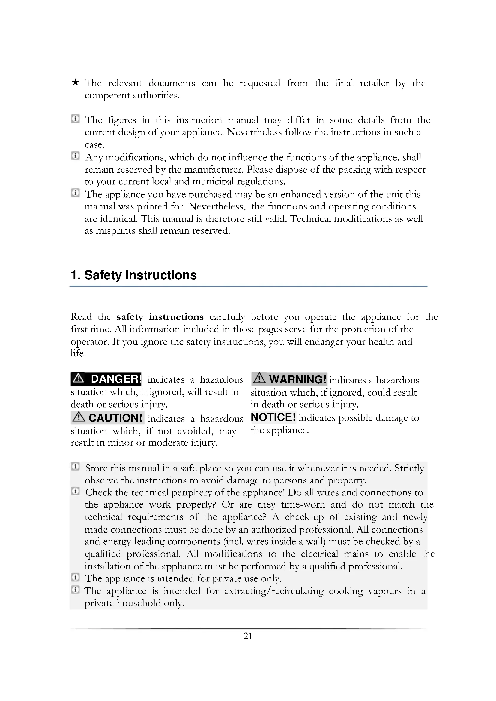 Store this manual in a safe place so you can use it whenever it is needed. Strictly observe the instructions to avoid damage to persons and property. Check the technical periphery of the appliance! Do all wires and connections to the appliance work properly? Or are they time-worn and do not match the technical requirements of the appliance? A check-up of existing and newly- made connections must be done by an authorized professional. All connections and energy-leading components (incl. wires inside a wall) must be checked by a qualified professional. All modifications to the electrical mains to enable the installation of the appliance must be performed by a qualified professional. The appliance is intended for private use only. The appliance is intended for extracting/recirculating cooking vapours in a private household only.22 The appliance is intended for indoor-use only. The appliance is not intended to be operated for commercial purposes, during camping and in public transport. Operate the appliance in accordance with its intended use only. Do not allow anybody who is not familiar with this instruction manual to operate the appliance. DANGER
