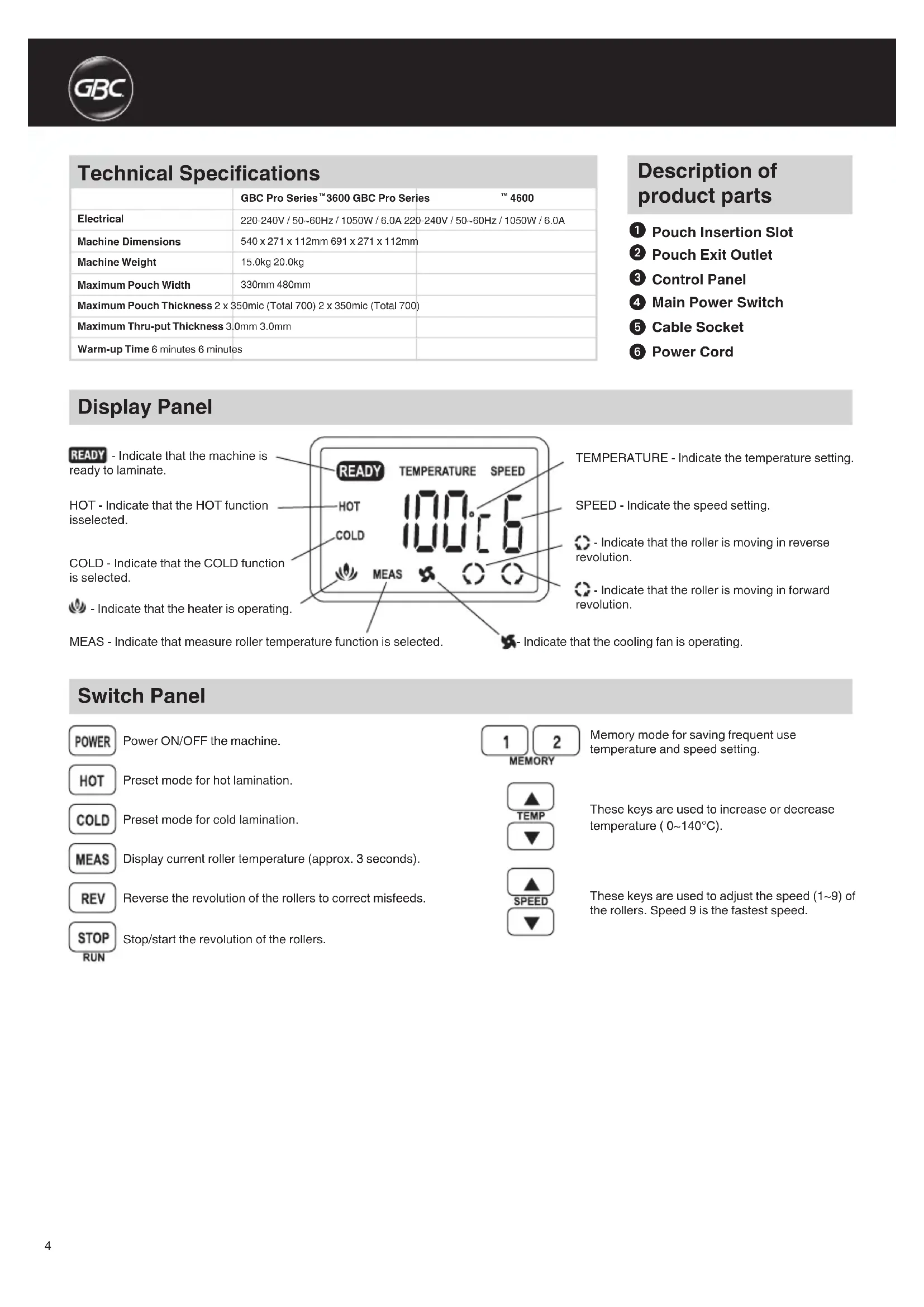 Power Cord TEMPERATURE - Indicate the temperature setting. - Indicate that the machine is ready to laminate. HOT - Indicate that the HOT function is selected. COLD - Indicate that the COLD function is selected. MEAS - Indicate that measure roller temperature function is selected. - Indicate that the heater is operating. SPEED - Indicate the speed setting. - Indicate that the roller is moving in reverse revolution. - Indicate that the roller is moving in forward revolution. - Indicate that the cooling fan is operating. DisplayPanel Switch Panel Power ON/OFF the machine. Preset mode for hot lamination. Preset mode for cold lamination. Display current roller temperature (approx. 3 seconds). Reverse the revolution of the rollers to correct misfeeds. Stop/start the revolution of the rollers. Memory mode for saving frequent use temperature and speed setting. These keys are used to increase or decrease temperature ( 0~140°C). These keys are used to adjust the speed (1~9) of the rollers. Speed 9 is the fastest speed.5