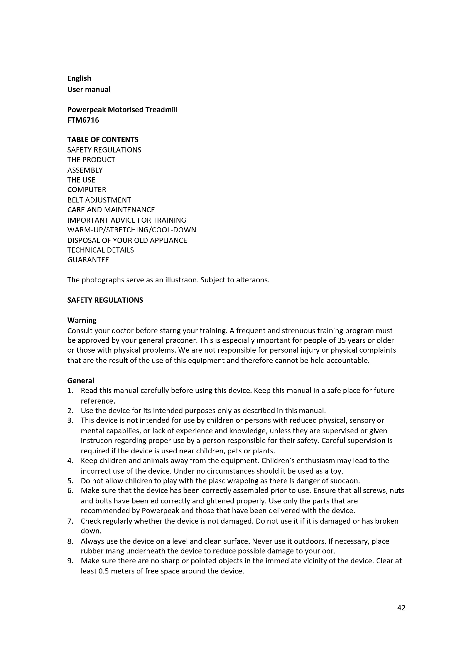 Download the instructions for your Treadmills in PDF format for free! Find your manual FTM6716 - Powerpeak and take your electronic device back in hand. On this page are published all the documents necessary for the use of your device. FTM6716 by Powerpeak.