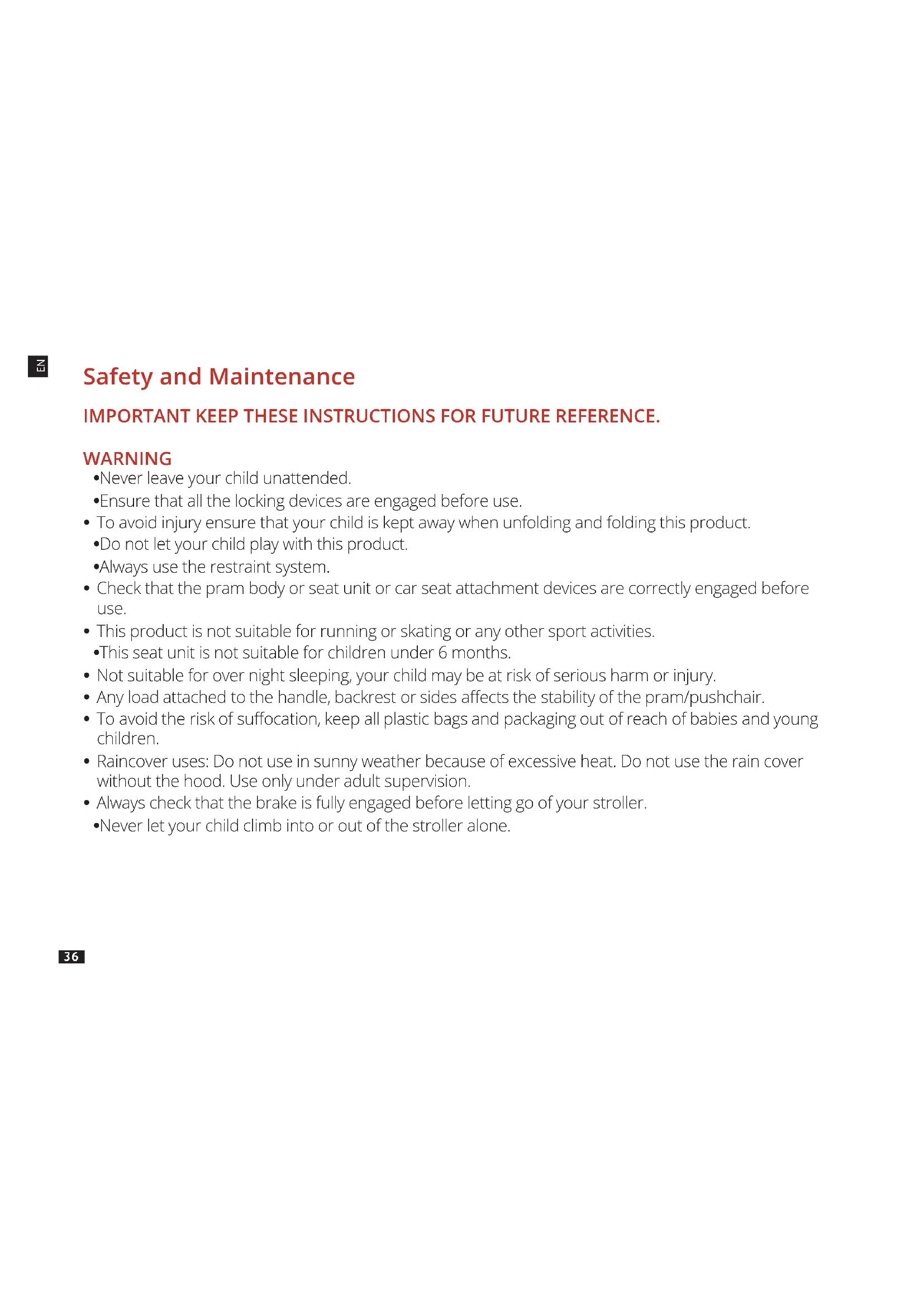 - Any load attached to the handle, backrest or sides aects the stability of the pram/pushchair.