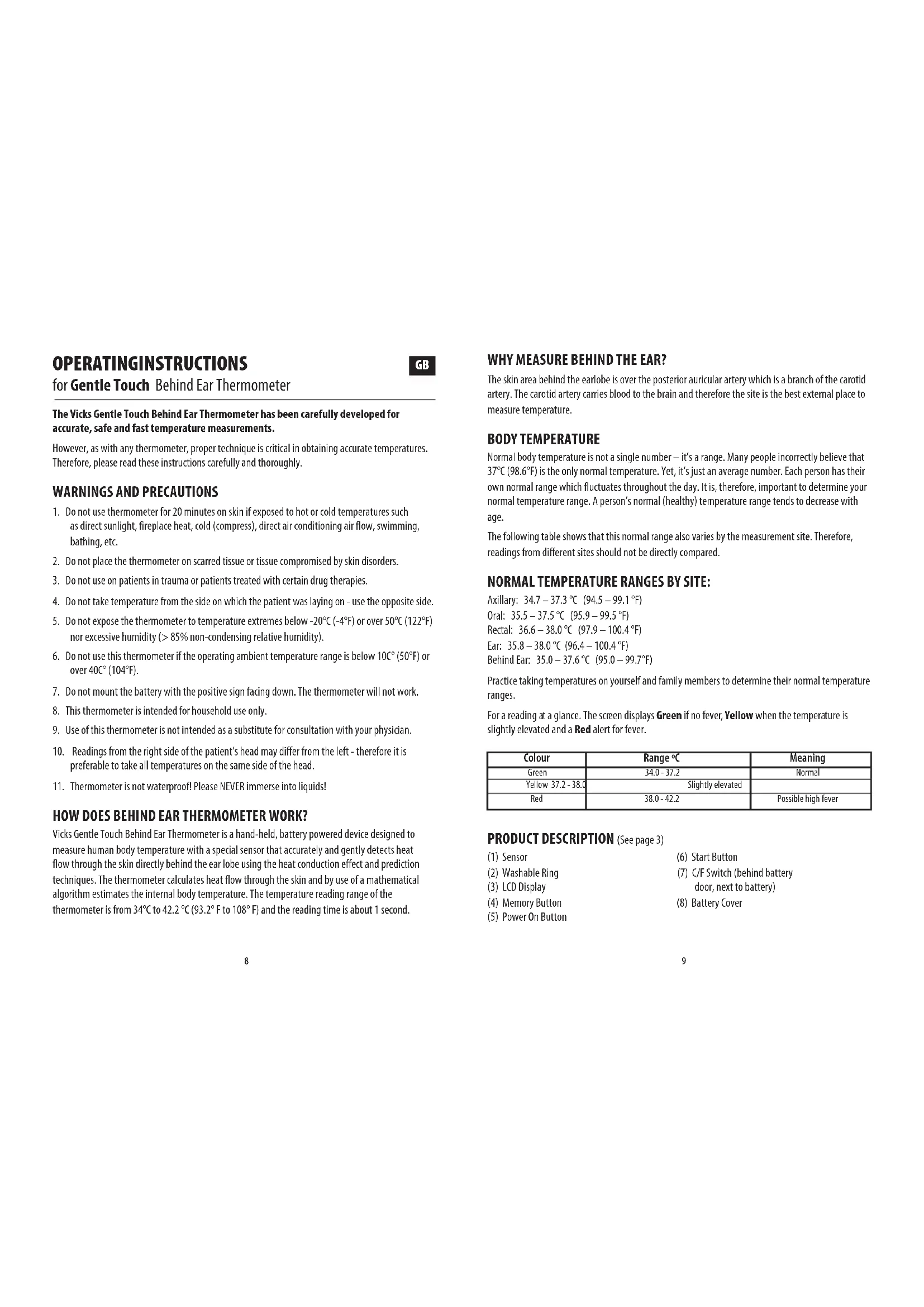 WHY MEASURE BEHIND THE EAR? The skin area behind the earlobe is over the posterior auricular artery which is a branch of the carotid artery. The carotid artery carries blood to the brain and therefore the site is the best external place to measure temperature. BODY TEMPERATURE Normal body temperature is not a single number – it’s a range. Many people incorrectly believe that 37°C (98.6°F) is the only normal temperature. Yet, it’s just an average number. Each person has their own normal range which fluctuates throughout the day. It is, therefore, important to determine your normal temperature range. A person’s normal (healthy) temperature range tends to decrease with age. The following table shows that this normal range also varies by the measurement site. Therefore, readings from different sites should not be directly compared. NORMAL TEMPERATURE RANGES BY SITE: Axillary: 34.7 – 37.3 °C (94.5 – 99.1 °F) Oral: 35.5 – 37.5 °C (95.9 – 99.5 °F) Rectal: 36.6 – 38.0 °C (97.9 – 100.4 °F) Ear: 35.8 – 38.0 °C (96.4 – 100.4 °F) Behind Ear: 35.0 – 37.6 °C (95.0 – 99.7°F) Practice taking temperatures on yourself and family members to determine their normal temperature ranges. For a reading at a glance. The screen displays Green if no fever, Yellow when the temperature is slightly elevated and a Red alert for fever. PRODUCT DESCRIPTION (See page 3) (1) Sensor (6) Start Button (2) Washable Ring (7) C/F Switch (behind battery (3) LCD Display door, next to battery) (4) Memory Button (8) Battery Cover (5) Power On Button Colour Range ºC Meaning Green 34.0 - 37.2 Normal Yellow 37.2 - 38.0 Slightly elevated Red 38.0 - 42.2 Possible high fever10 11