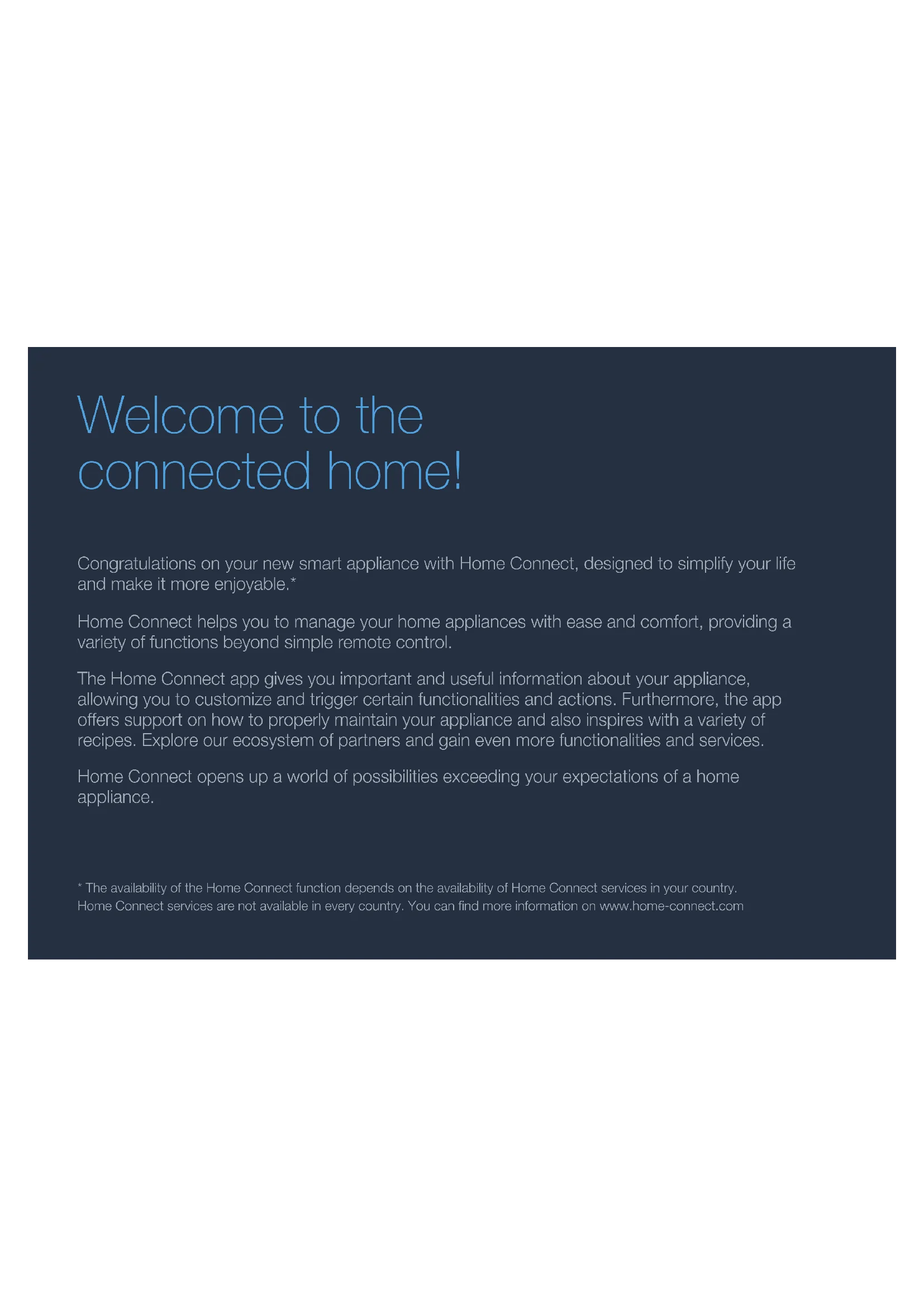 18 DE Congratulations on your new smart appliance with Home Connect, designed to simplify your life and make it more enjoyable.* Home Connect helps you to manage your home appliances with ease and comfort, providing a variety of functions beyond simple remote control. The Home Connect app gives you important and useful information about your appliance, allowing you to customize and trigger certain functionalities and actions. Furthermore, the app offers support on how to properly maintain your appliance and also inspires with a variety of recipes. Explore our ecosystem of partners and gain even more functionalities and services. Home Connect opens up a world of possibilities exceeding your expectations of a home appliance.
