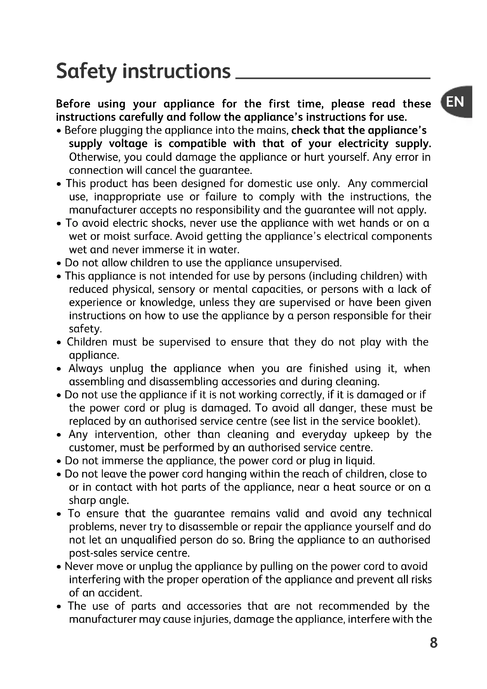 Safety instructions Before using your appliance for the first time, please read these instructions carefully and follow the appliance’s instructions for use.