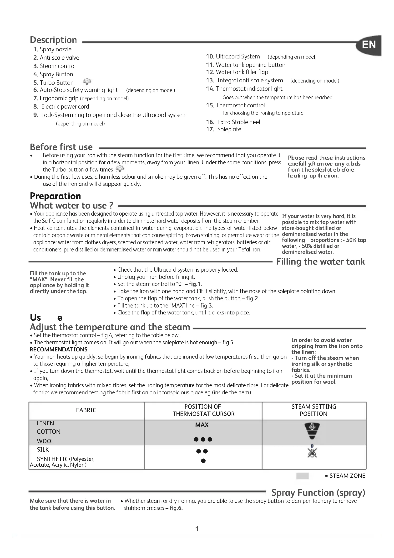 - Set the thermostat control – fig.4, referring to the table below.• The thermostat light comes on. It will go out when the soleplate is hot enough – fig.5.RECOMMENDATIONS• Your iron heats up quickly: so begin by ironing fabrics that are ironed at low temperatures first, then go onto those requiring a higher temperature,• If you turn down the thermostat, wait until the thermostat light comes back on before beginning to ironagain,• When ironing fabrics with mixed fibres, set the ironing temperature for the most delicate fibre. For delicatefabrics we recommend testing the fabric first on an inconspicious place eg (inside the hem). Spray Function (spray)