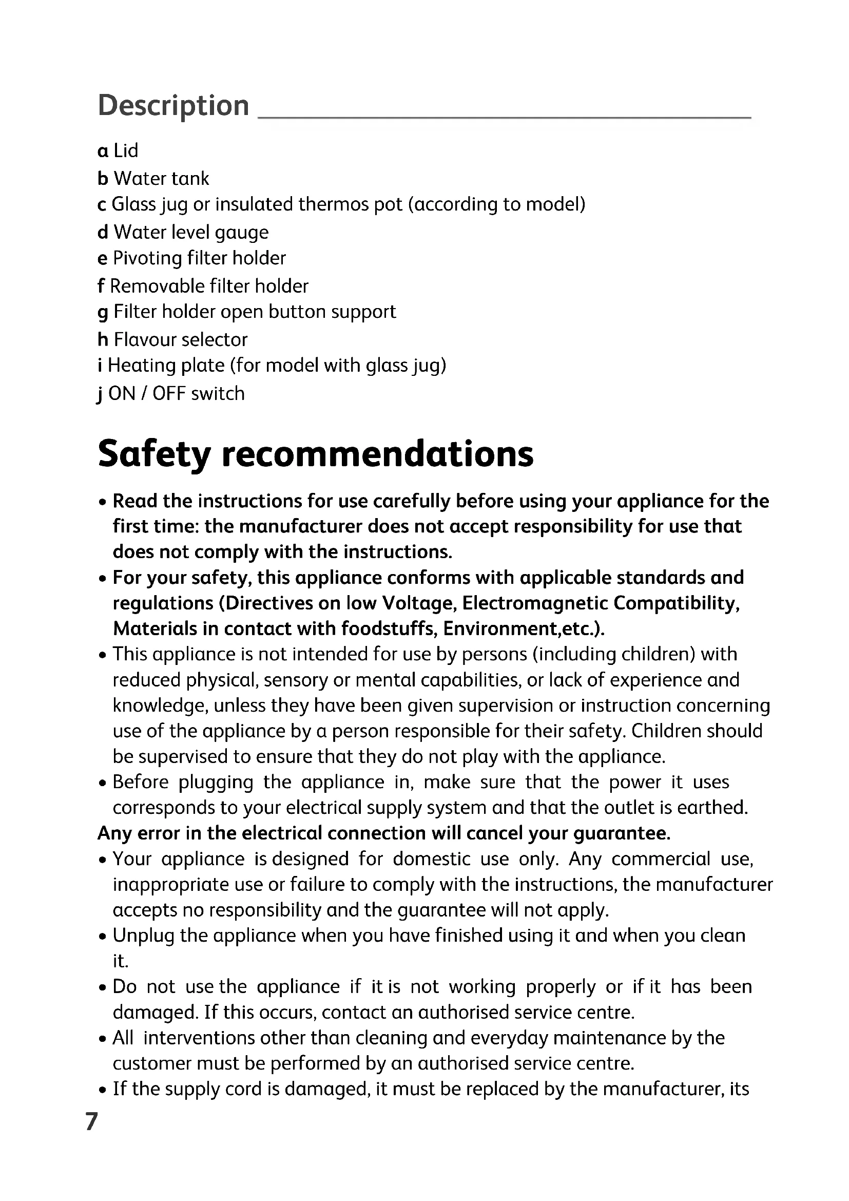 SM_COFFEE-MAKER-EXPRESS_Mise en page 1 20/05/11 14:43 Page6Description a Lid b Water tank c Glass jug or insulated thermos pot (according to model) d Water level gauge e Pivoting filter holder f Removable filter holder g Filter holder open button support h Flavour selector i Heating plate (for model with glass jug) j ON / OFF switch Safety recommendations