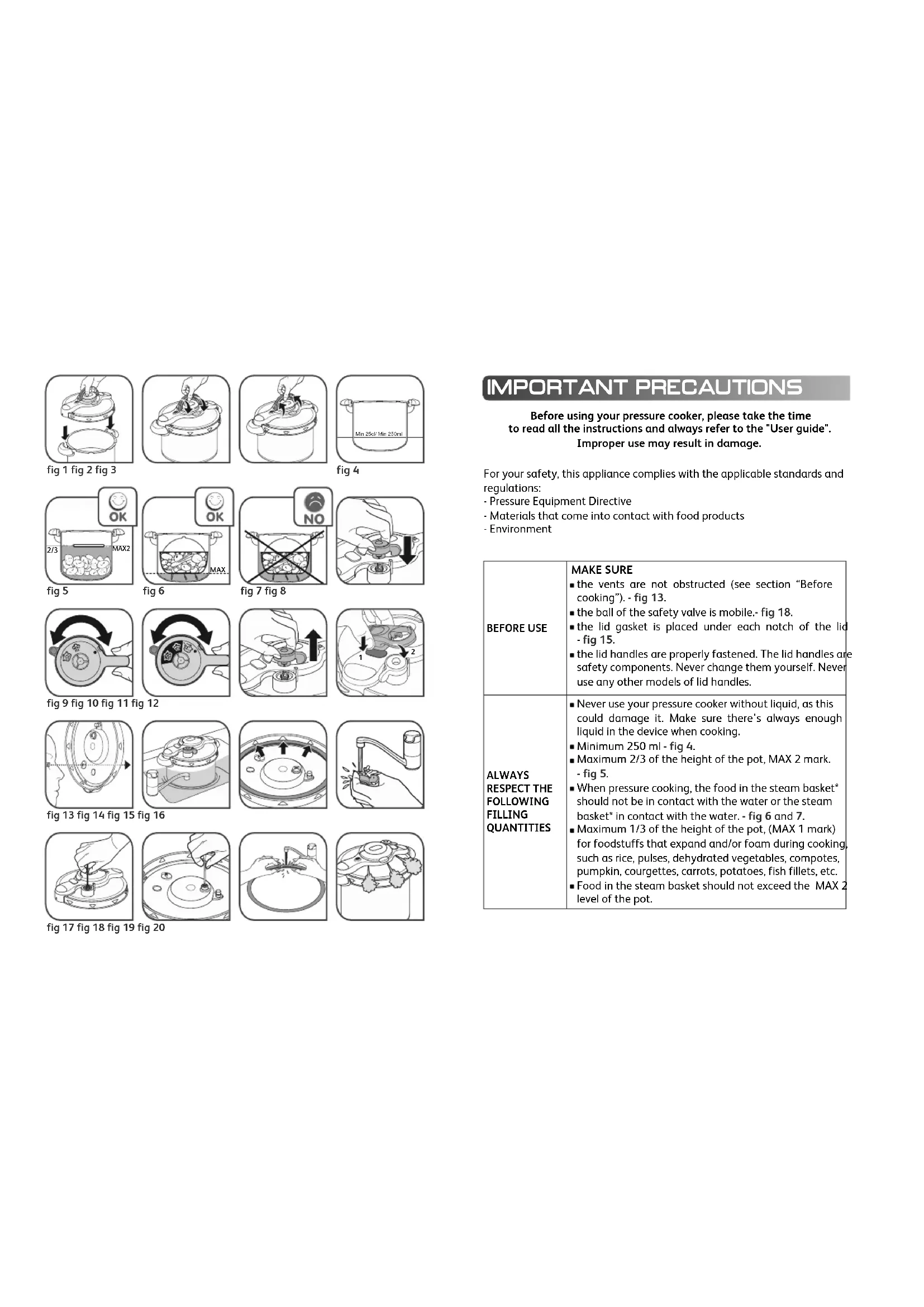 fig 13 fig 14 fig 15 fig 16 fig 17 fig 18 fig 19 fig 20 Before using your pressure cooker, please take the time to read all the instructions and always refer to the "User guide". Improper use may result in damage. For your safety, this appliance complies with the applicable standards and regulations: - Pressure Equipment Directive - Materials that come into contact with food products - Environment IMPORTANT PRECAUTIONS BEFORE USE MAKE SURE the vents are not obstructed (see section “Before cooking”). - fig 13. the ball of the safety valve is mobile.- fig 18. the lid gasket is placed under each notch of the lid - fig 15. the lid handles are properly fastened. The lid handles are safety components. Never change them yourself. Never use any other models of lid handles. ALWAYS RESPECT THE FOLLOWING FILLING QUANTITIES Never use your pressure cooker without liquid, as this could damage it. Make sure there's always enough liquid in the device when cooking. Minimum 250 ml - fig 4. Maximum 2/3 of the height of the pot, MAX 2 mark. - fig 5. When pressure cooking, the food in the steam basket* should not be in contact with the water or the steam basket* in contact with the water. - fig 6 and 7. Maximum 1/3 of the height of the pot, (MAX 1 mark) for foodstuffs that expand and/or foam during cooking, such as rice, pulses, dehydrated vegetables, compotes, pumpkin, courgettes, carrots, potatoes, fish fillets, etc. Food in the steam basket should not exceed the MAX 2 level of the pot. TE_IFU_CLIPSOMINUT_1520007351_COVER_SPIN22MM.qxp_Mise en page 1 20/08/2018 16:56 Page21