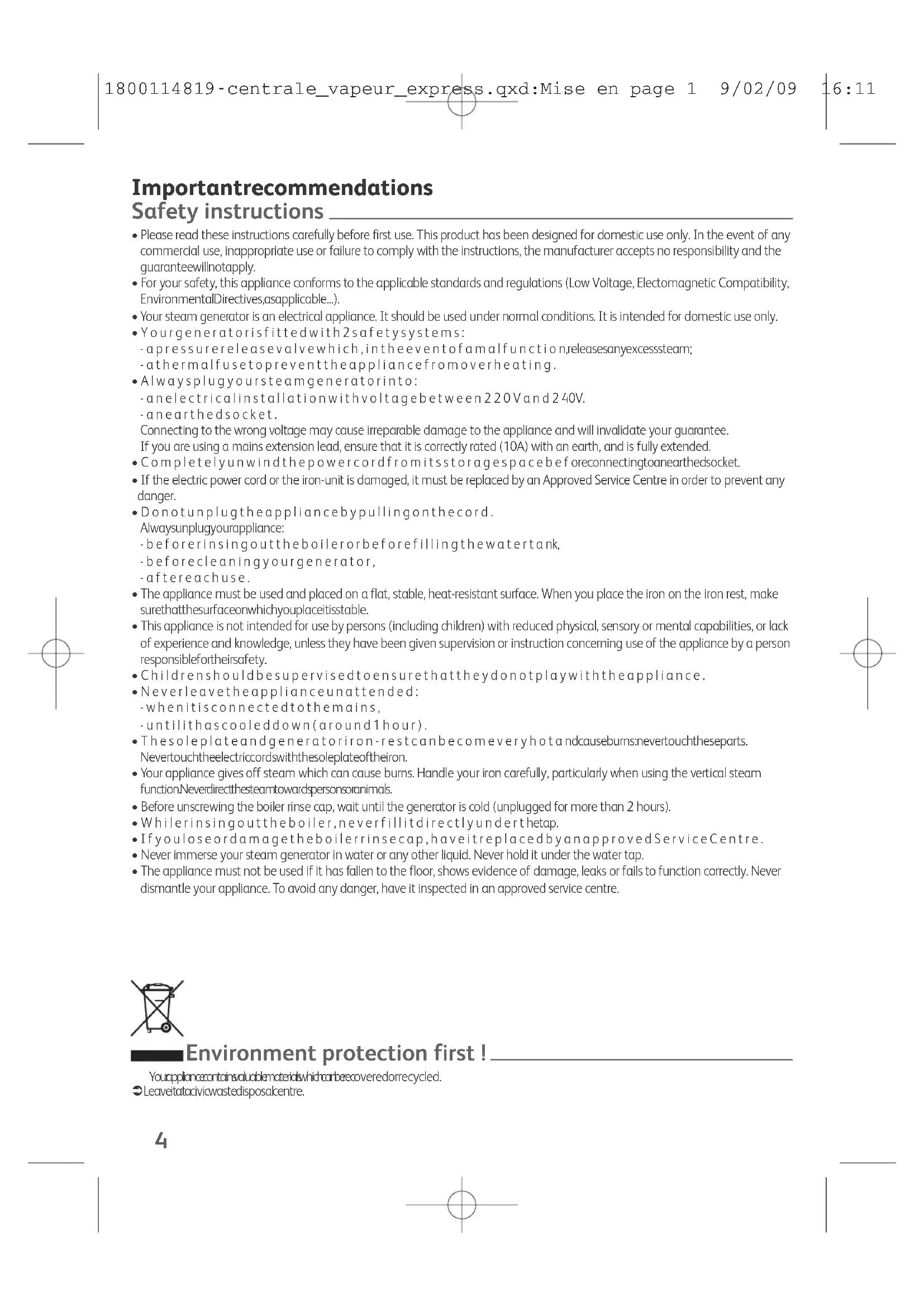 - Theappliancemustnotbeusedifithasfallentothefloor,shows evidence of damage, leaks or f ails to f unction correctly. Never dismantle your appliance. To av oid any danger, have it inspected in an approved service centre. Environment protection first ! Your appliance contains valuable materials which can be recovered or recycled. ! Leave it at a civic waste disposal centre. 1800114819-centrale_vapeur_express.qxd:Mise en page 1 9/02/09 16:11 Page 45