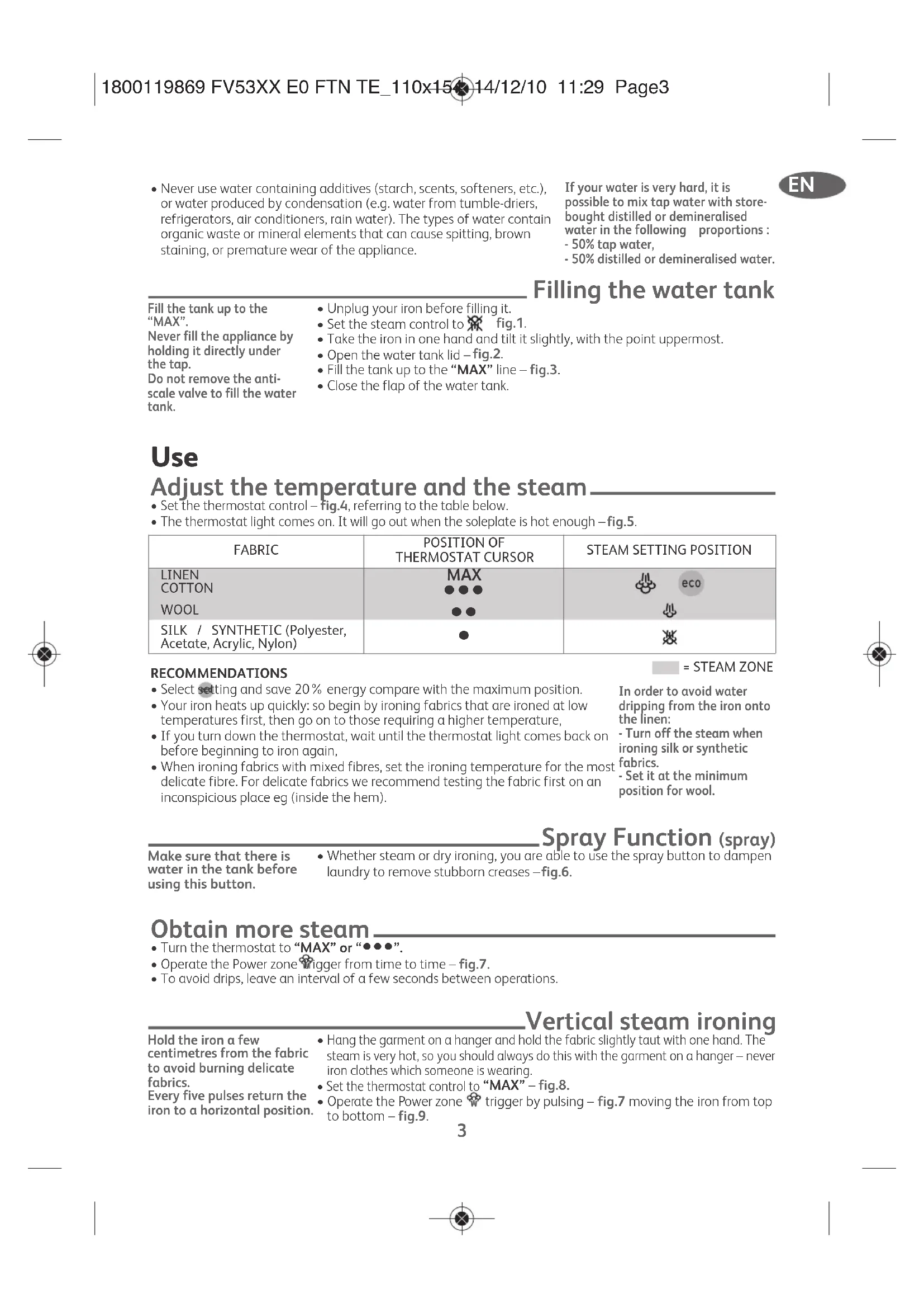 - Your appliance has been designed to operate using untreated tap water. However, it is necessary to operate the Self-Clean function regularly in order to eliminate hard water deposits from the steam chamber. 1800119869 FV53XX E0 FTN TE_110x154 14/12/10 11:29 Page21800119869 FV53XX E0 FTN TE_110x154 14/12/10 11:29 Page3EN
