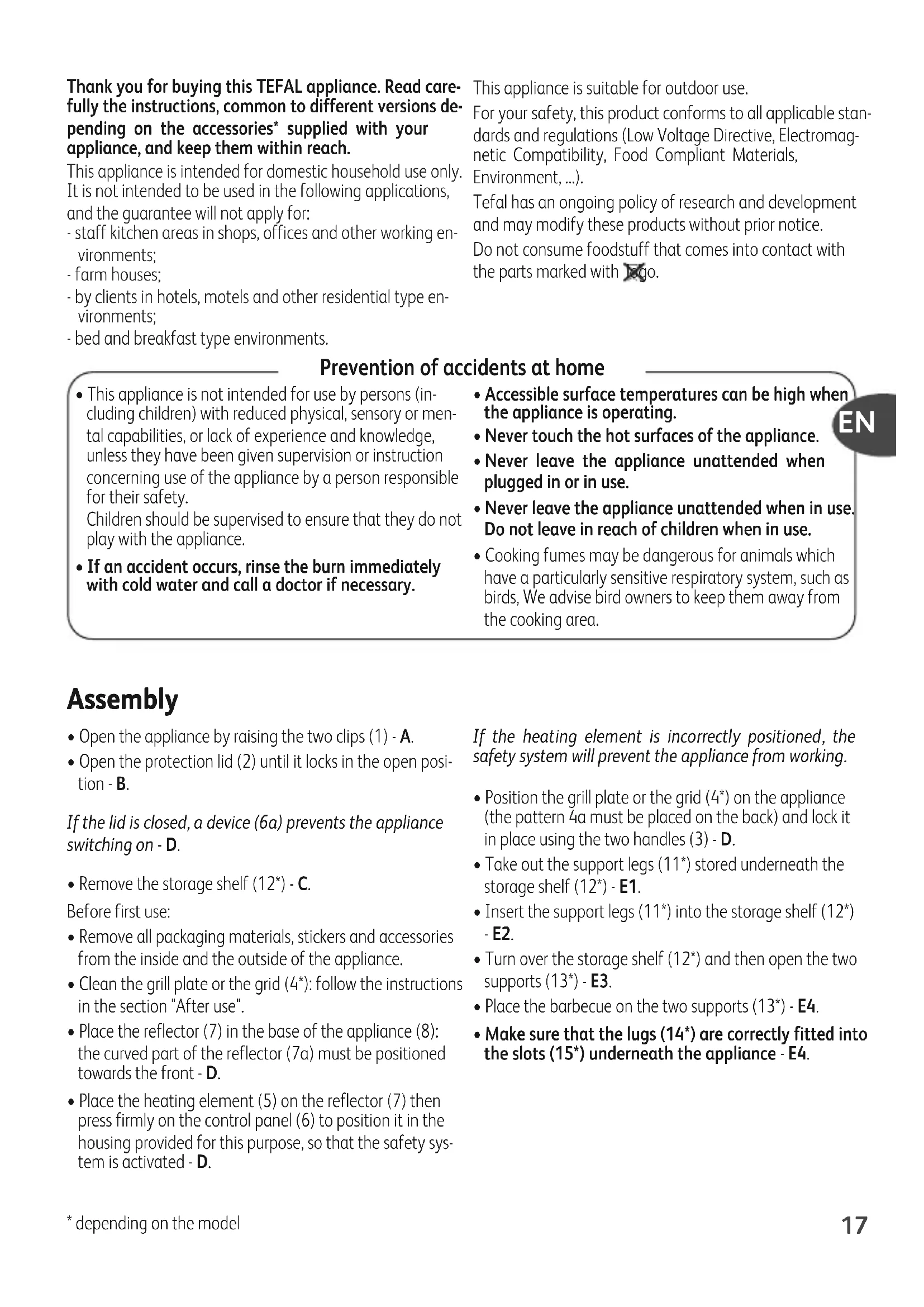 Thank you for buying this TEFAL appliance. Read care- fully the instructions, common to different versions de- pending on the accessories* supplied with your appliance, and keep them within reach. This appliance is intended for domestic household use only. It is not intended to be used in the following applications, and the guarantee will not apply for: - staff kitchen areas in shops, offices and other working en- vironments; - farm houses; - by clients in hotels, motels and other residential type en- vironments; - bed and breakfast type environments. This appliance is suitable for outdoor use. For your safety, this product conforms to all applicable stan- dards and regulations (Low Voltage Directive, Electromag- netic Compatibility, Food Compliant Materials, Environment, ...). Tefal has an ongoing policy of research and development and may modify these products without prior notice. Do not consume foodstuff that comes into contact with the parts marked with logo. Prevention of accidents at home